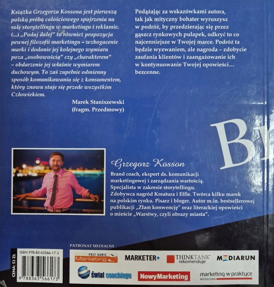 Podaj dalej, czyli jak stworzyć porywającą opowieść dla marki” to fascynująca podróż do świata marek, które swoimi historiami porywają tłumy. Jednak nie same marki, ich sukcesy są tu najważniejsze. Istotne jest to jak odnalazły w sobie powołanie, odkryły swój talent. Książka nie jest poradnikiem o sztuce opowiadania. Podaj dalej...” sama w sobie jest opowieścią. Literacka forma narracji i niesztampowy styl wypowiedzi autora sprawia, że przedstawione narzędzia traktujemy jako element fabuły większej opowieści... Podążając za wskazówkami autora, tak jak mityczny bohater wyruszysz w podróż, by przedzierając się przez gąszcz rynkowych pułapek, odkryć to co najcenniejsze w Twojej marce. Ta podróż będzie wyzwaniem, ale nagroda - zdobycie zaufania klientów i zaangażowanie ich w kontynuowanie Twojej opowieści, będzie bezcenna. Książka Grzegorza Kossona jest pierwszą polską próbą całościowego spojrzenia na rolę storytellingu w marketingu i reklamie. (...) "Podaj dalej" to również propozycja pewnej filozofii marketingu - wzbogacenie marki i dodanie jej kolejnego wymiaru poza "osobowością" czy "charakterem" - obdarzenie jej właśnie wymiarem duchowym. To zaś zupełnie odmienny sposób komunikowania się z konsumentem, który znowu staje się przede wszystkim Człowiekiem. Marek Staniszewski (z przedmowy)