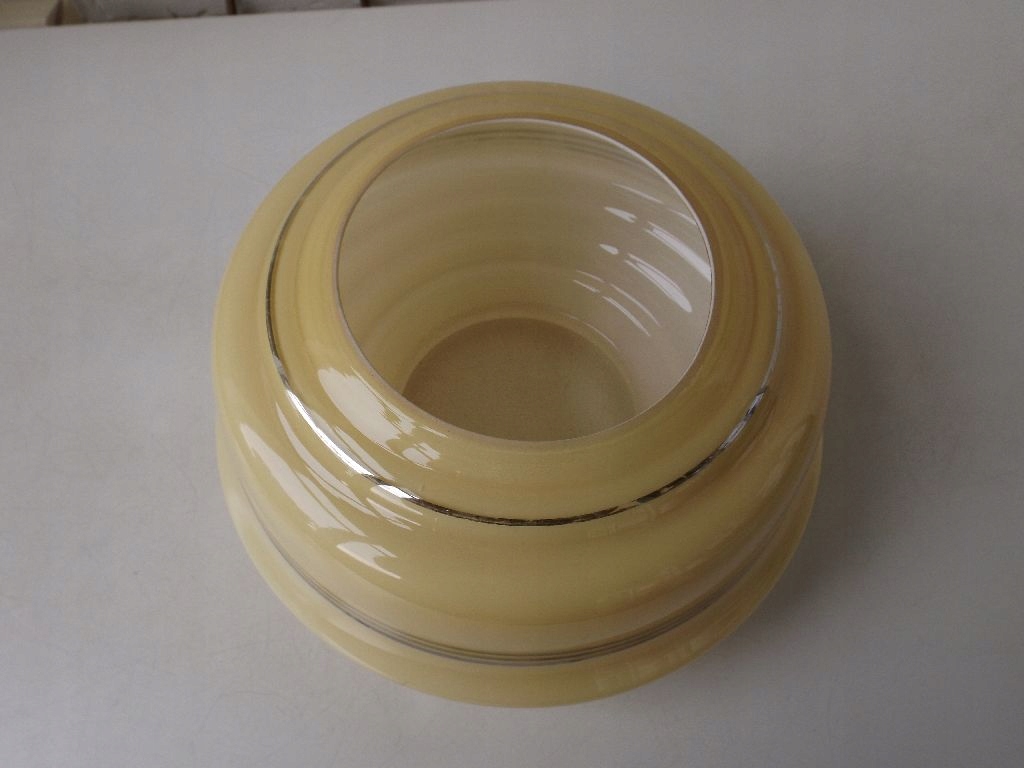 Do sprzedania mam piękny stary klosz - amplę . Jest wykonany ze szkła warstwowego wewnątrz biały a na zewnątrz żółty, dekorowany srebrnymi paskami. Klosz jest cały, bez pęknięć, klejenia i ubytków. W kilku miejscach są przetarcia srebrnych pasków. Klosz jest przystosowany do montażu w koszyku za pomocą śrubek – ma tzw. kryzę montażową na koszyk ( trzymacz) o średnicy ok. 16 cm.
