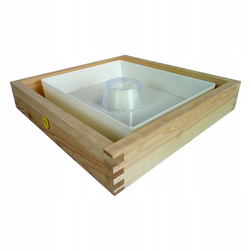 Mieści do 6 litrów syropu, dzięki czemu podkarmianie nie jest czasochłonne. Podkarmiaczkę stawiamy na powałce z wyciągniętym środkowym pajączkiem. Pszczoły wchodzą od dołu i pobierają syrop wewnątrz. Dzięki przezroczystemu kołpakowi pszczoły nie rozchodzą się po podkarmiaczce. Zastosowanie przezroczystej pokrywki przyspiesza przegląd, ponieważ nie musimy tracić czasu na podnoszenie i sprawdzanie ile syropu jest jeszcze w podkarmiaczce.