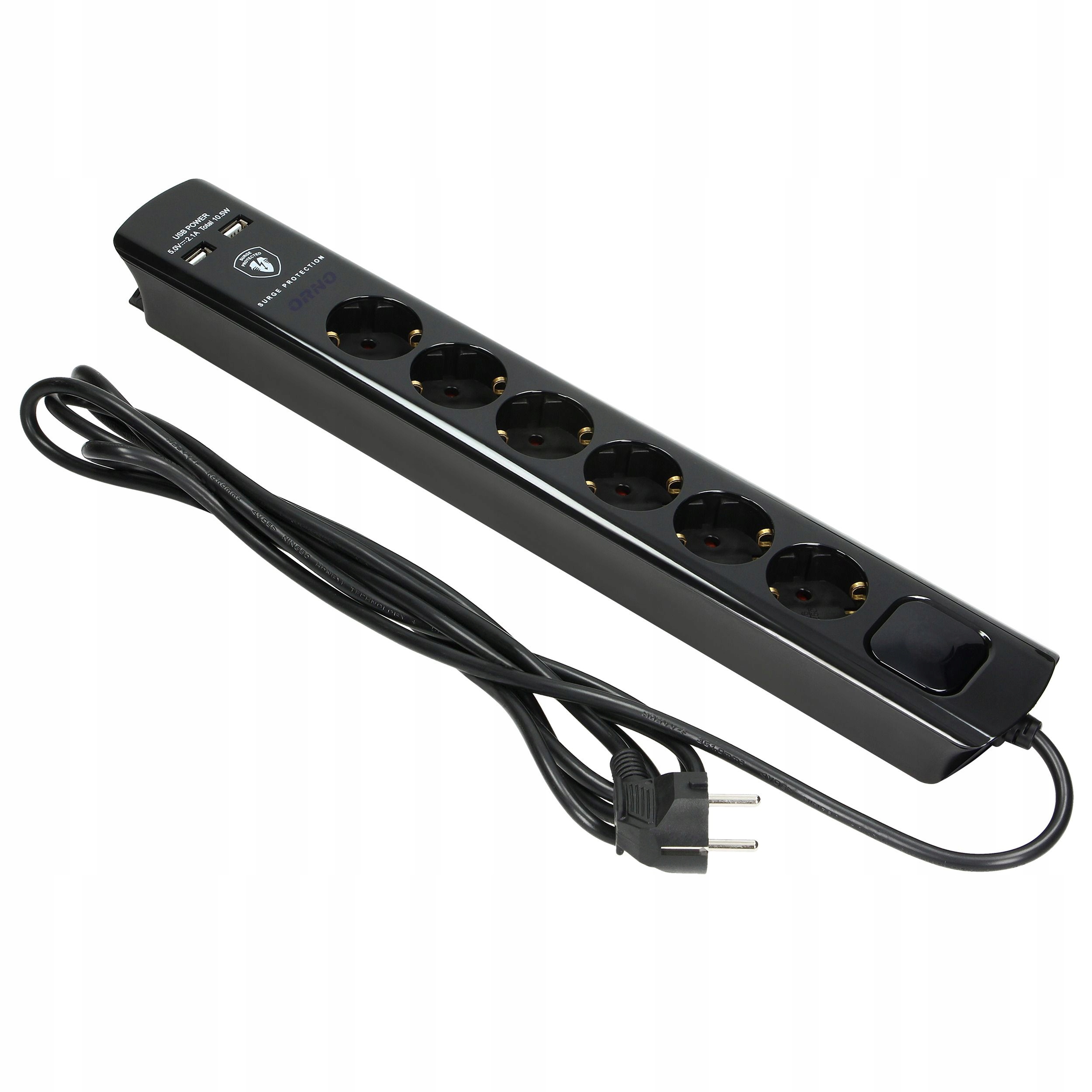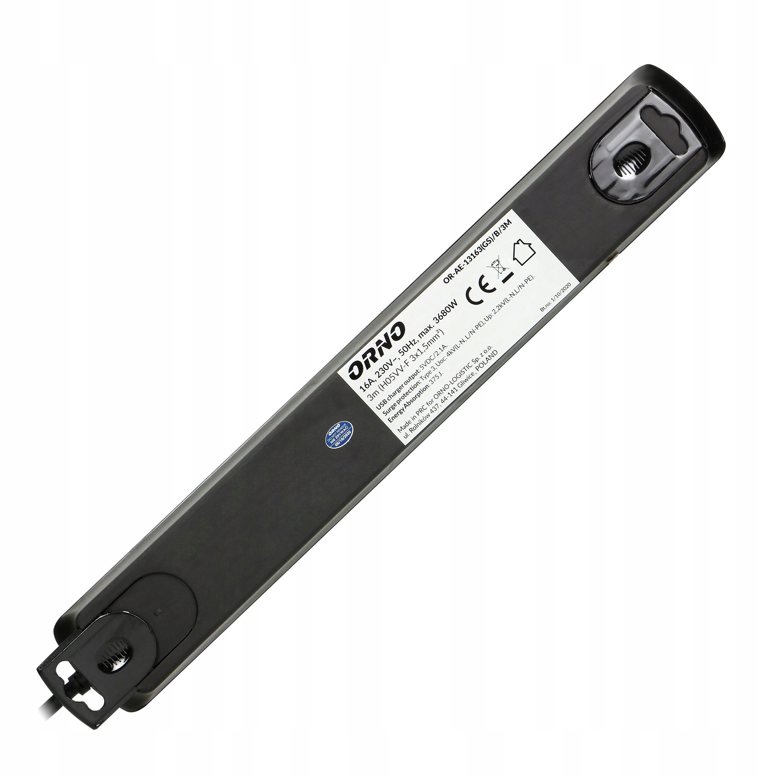 Orno OR-AE-13163(GS)/B/3M Listwa przeciwprzepięciowa, 6 gniazd 2P+Z (Schuko), kabel 3x1,5mm², długość 3m, czarna, 16A/230 VAC, z ochronnikiem przeciwprzepięciowym - typ 3, ładowarką 2xUSB 2,1A.