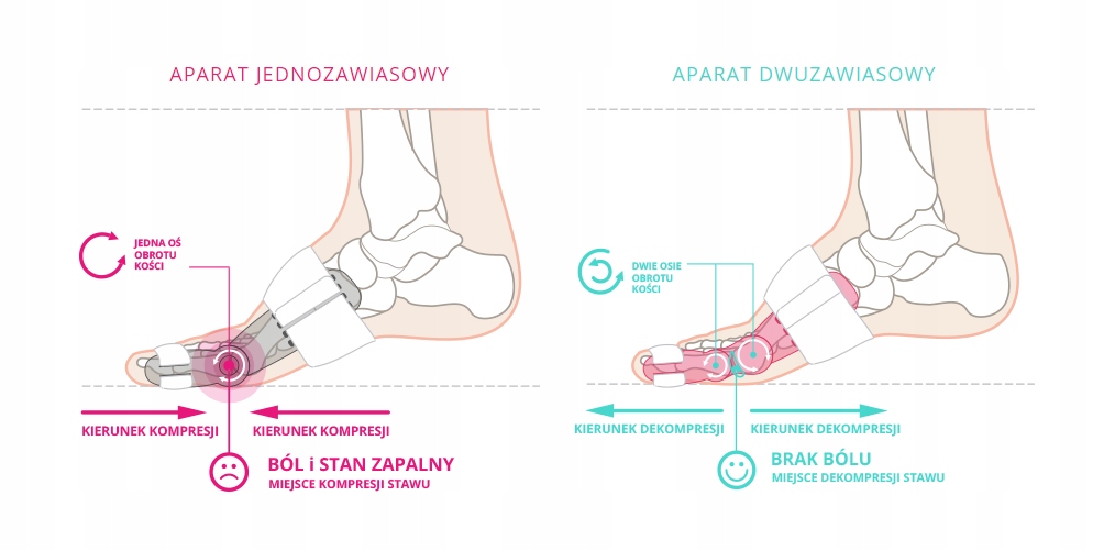 Badania potwierdziły, że aparaty korekcyjne Bunito Duo dzięki zastosowaniu dwóch osi obrotu nie tylko precyzyjnie dopasowują się do ruchów stawu, ale również aktywnie korygują deformację podczas chodzenia. W przeciwieństwie do korektorów na haluksy z jedną osią, które mogą powodować nadmierne ścieranie kości i kompresję, co często prowadzi do stanu zapalnego i zwiększenia bólu, aparat na haluksy Bunito Duo redukuje te potencjalne dolegliwości.