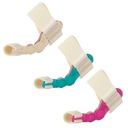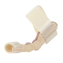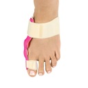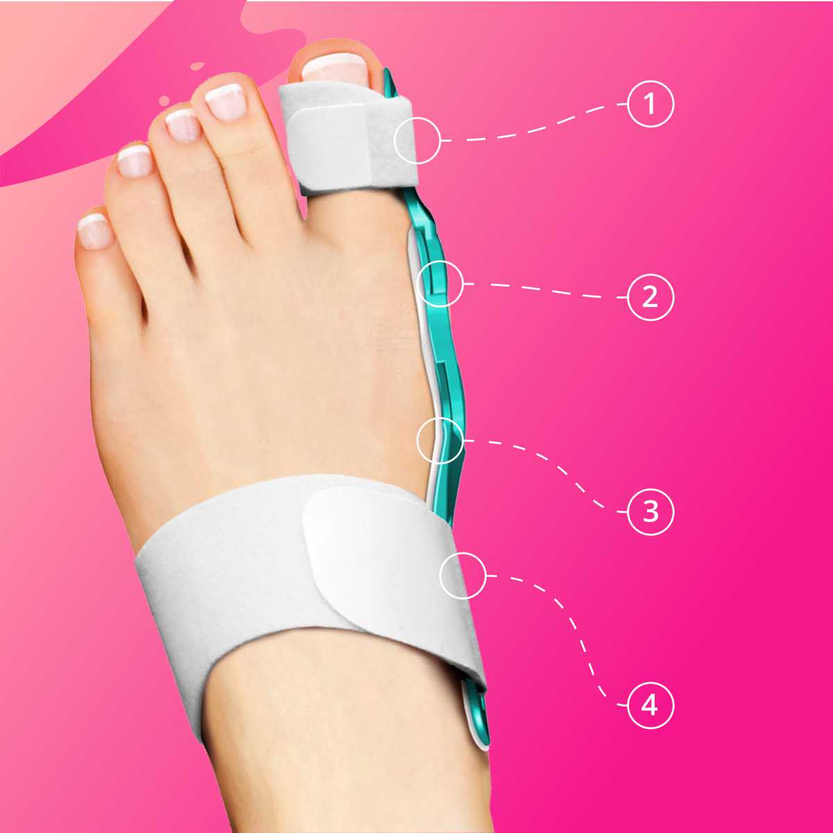 1: Znajdująca się w ortezie na haluksy opaska na paluch odciąga go od pozostałych palców i koryguje jego ustawienie tak, aby znajdował się w prawidłowej pozycji.