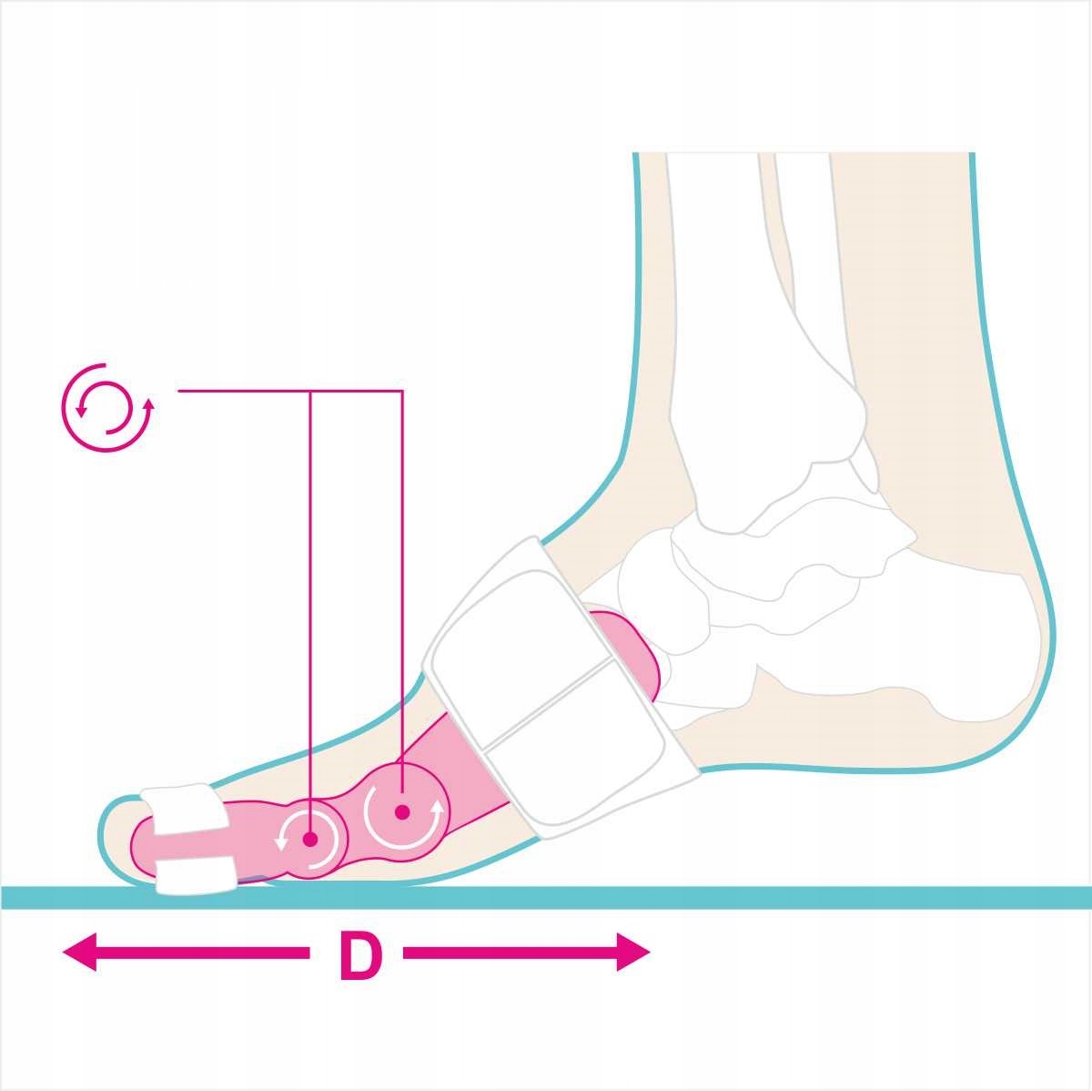 4: Trwała i wygodna opaska na śródstopie zbliża kości śródstopia do siebie, co wpływa na redukcję płaskostopia poprzecznego, a dodatkowo przywraca właściwą funkcję mięśnia zginacza palucha, co wpływa na poprawę kondycji zniekształconej stopy.