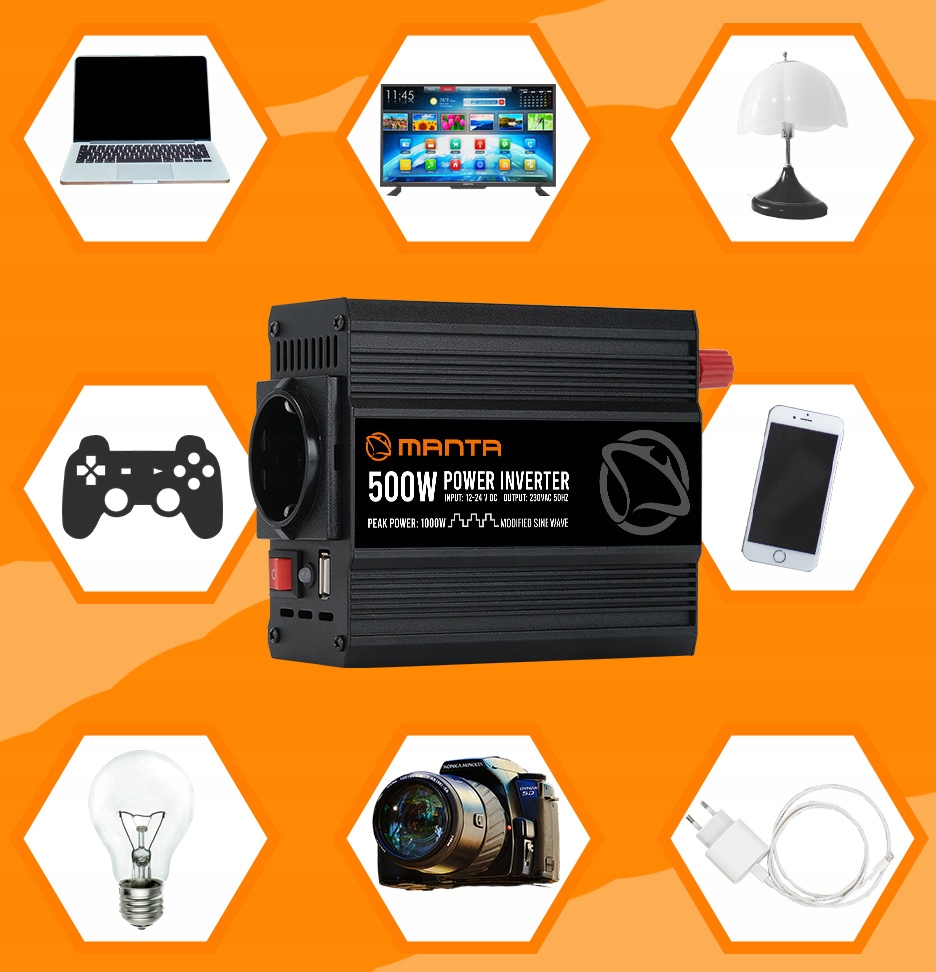 ☑️ Zapewnia przetworzenie prądu stałego 12V/24V na prąd zmienny 230V