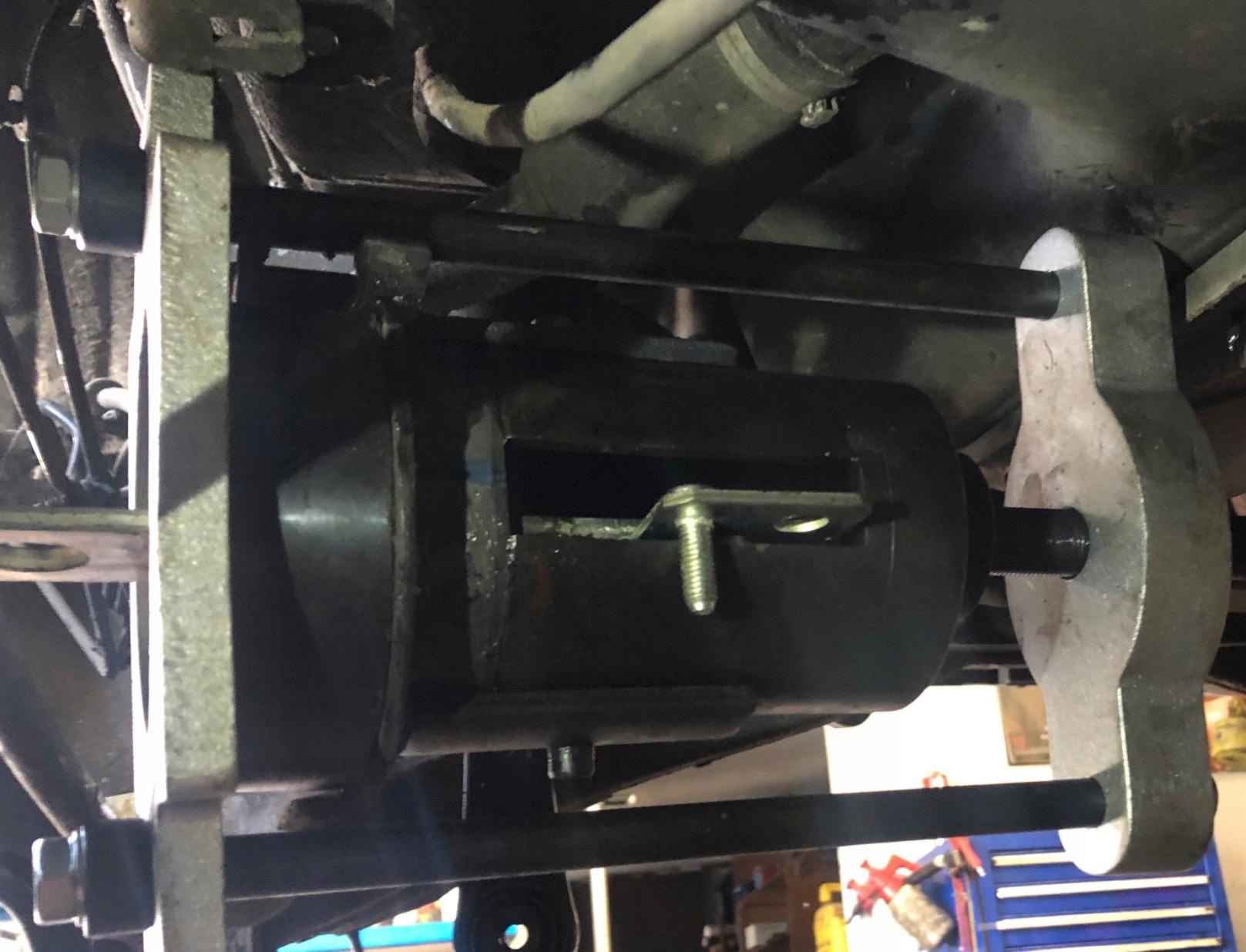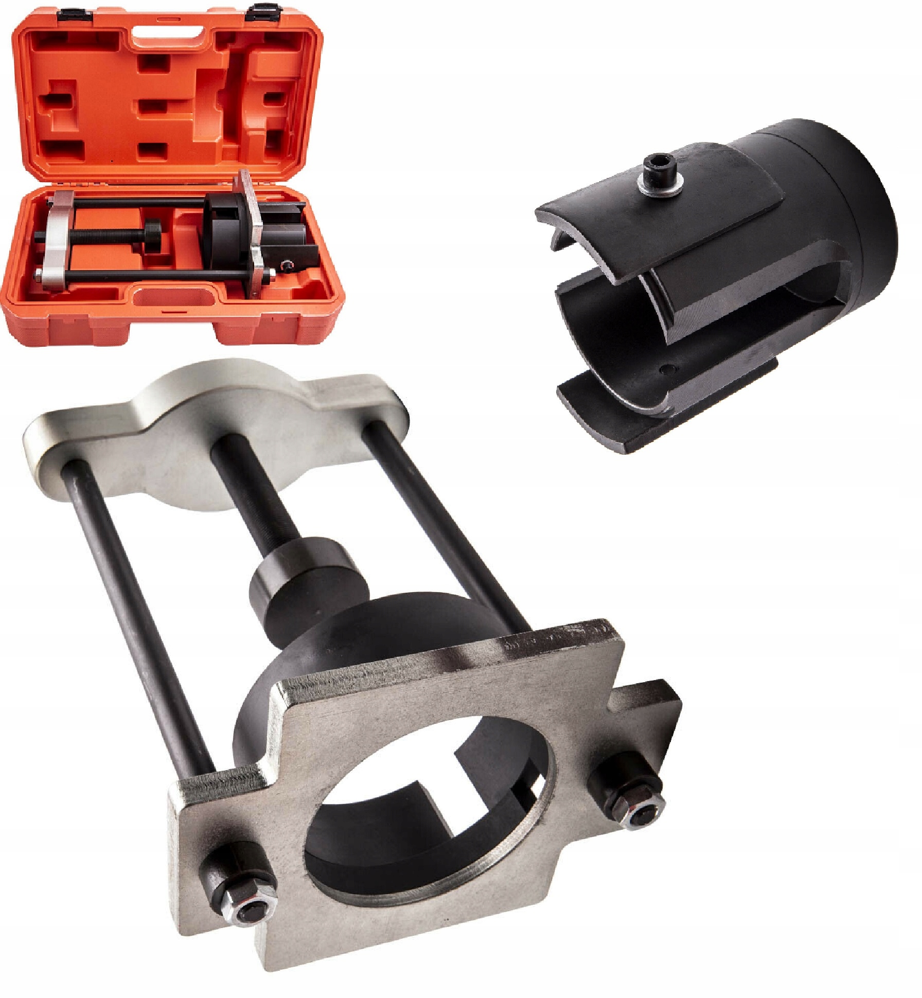 Съемник марки AMD Tools используется для монтажа и демонтажа металлических резиновых втулок коромысла продольный Ford MK4 и Volvo без демонтажа рычага управления.