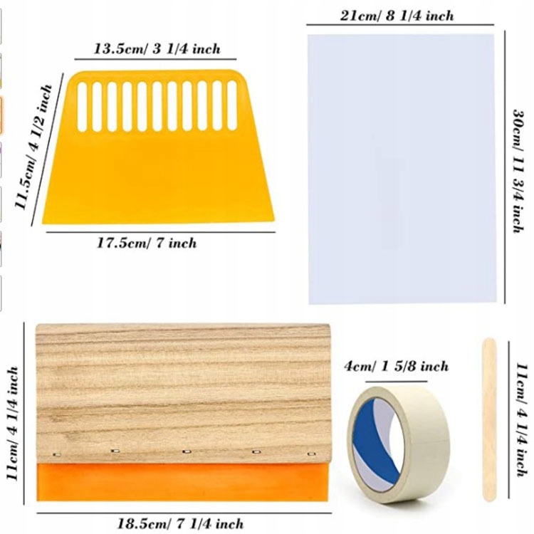 PAKIET ZAWIERA: Zawiera 1 sztukę drewnianych ramek do sitodruku o wymiarach 15,75 x 11,81 cala z białą siatką 110 + 1 sztukę rakla do sitodruku + 1 sztukę plastikowego skrobaka + 10 sztuk przezroczystej folii do drukarek atramentowych + 1 sztuka maski w rolce + 10 sztuk drewnianego patyczka.