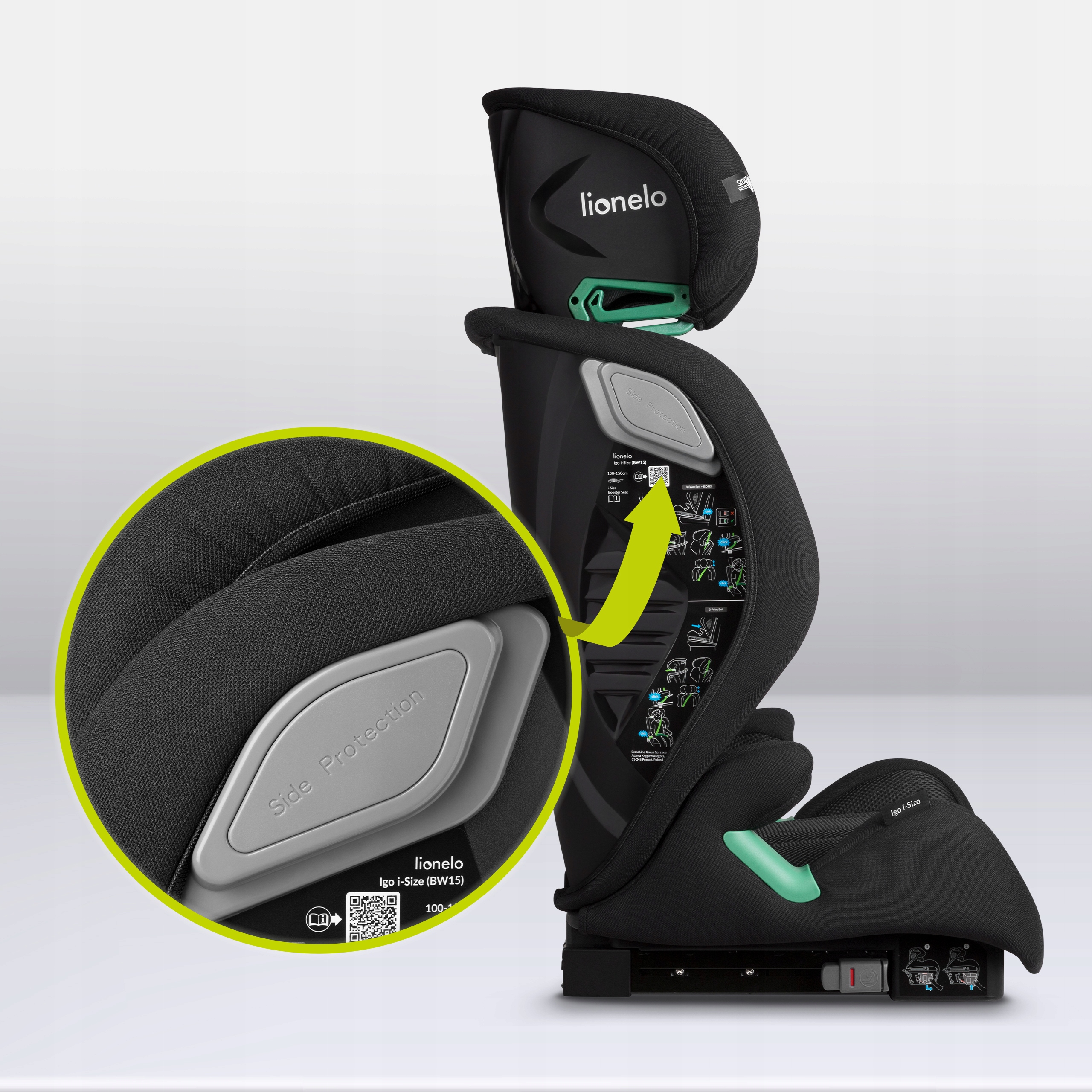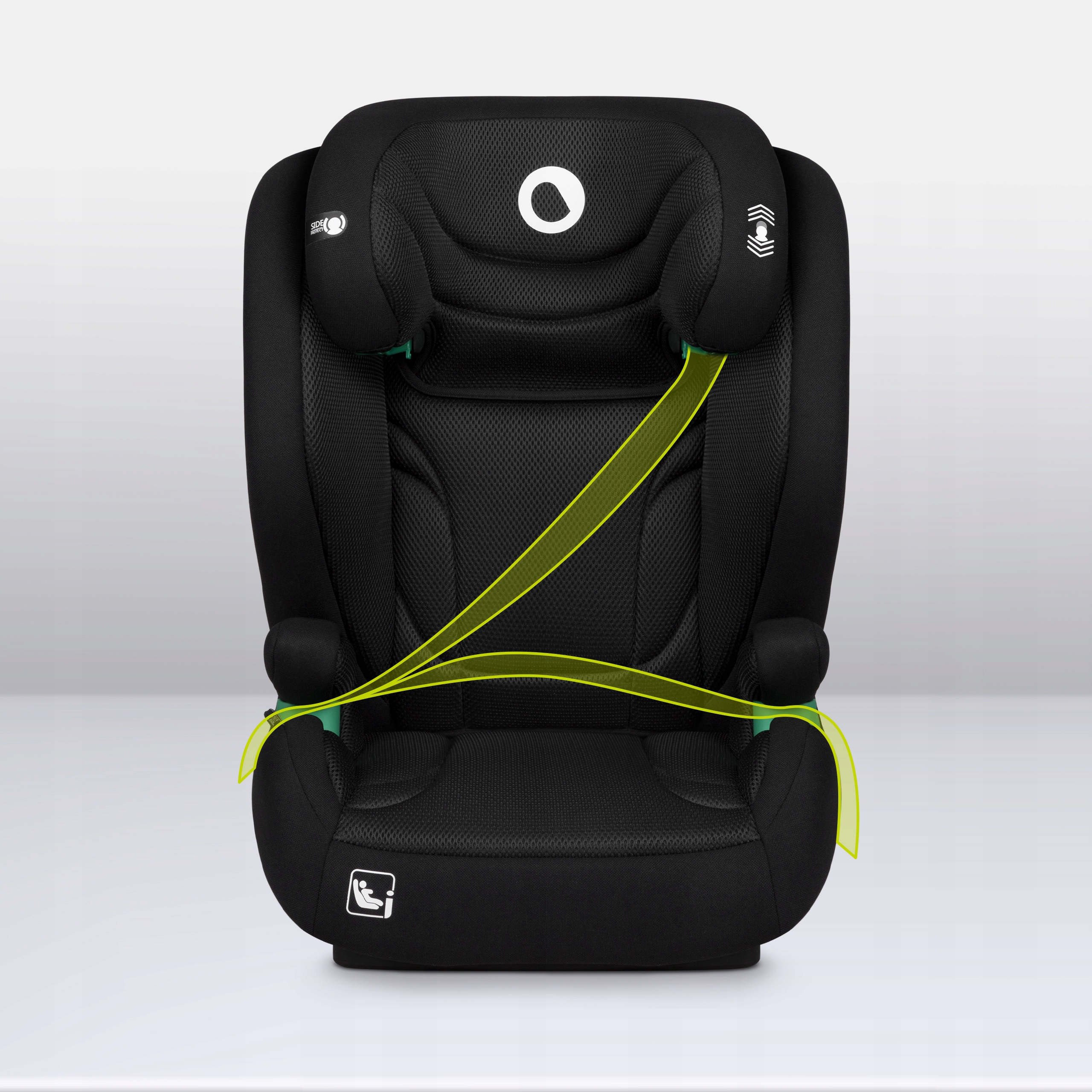 Igo i-Size предназначен для установки fwf, то есть лицом вперед. Крепление автокресла это делается с помощью системы ISOFIX и автомобильных ремней безопасности. Если данный модель автомобиля не была оснащена системой ISOFIX, возможна сборка только с помощью автомобильные ремни. Это позволяет Igo и-Size вписаться в любой автомобиль. Разъемы ISOFIX в с помощью изменения цвета индикатора на зеленый, они информируют пользователя о правильной фиксации сиденья. W если вы используете только ремни, в правильной застежке помогут специальные зеленые направляющие, которые указывают направление движения полос.