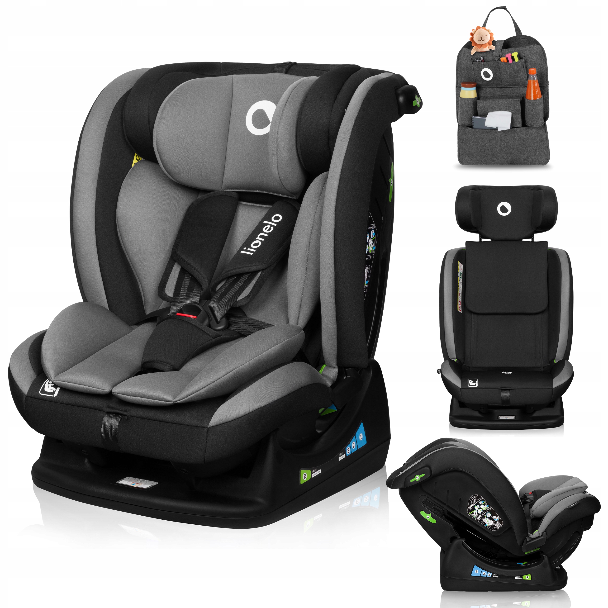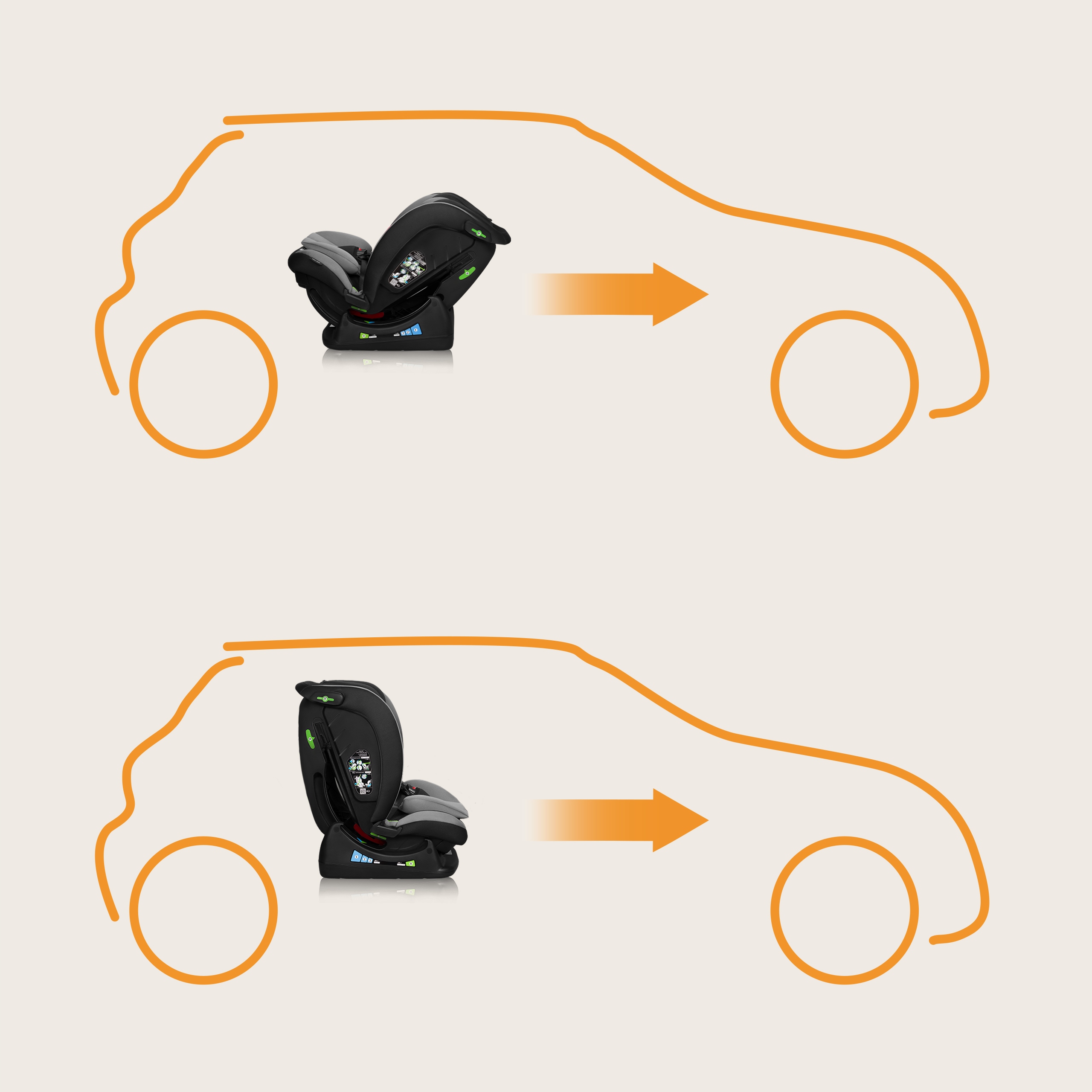 Ze względu na szeroki zakres wzrostowy fotelik umożliwia montaż zarówno przodem, jak i tyłem do kierunku jazdy.