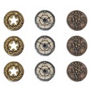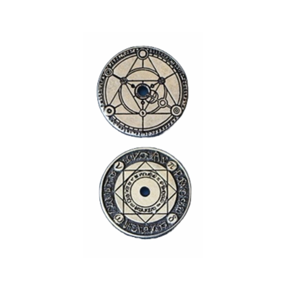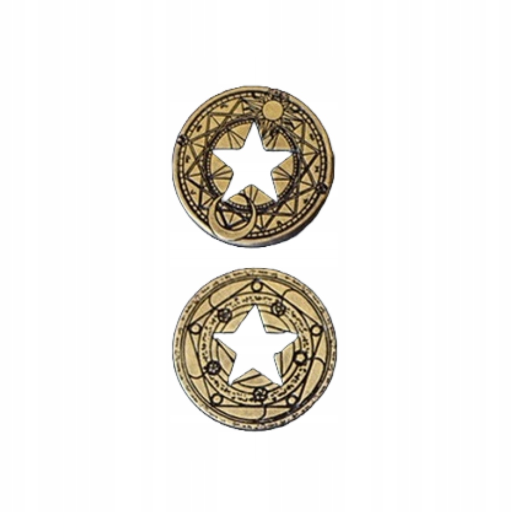 Wykonany ze stopów cynku zestaw 9 masywnych, precyzyjnie zdobionych monet zainspirowanych magicznymi kręgami, pieczęciami i przywołaniami.