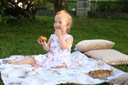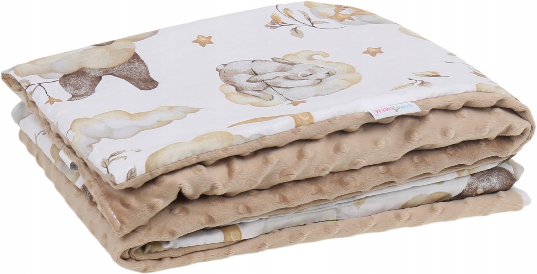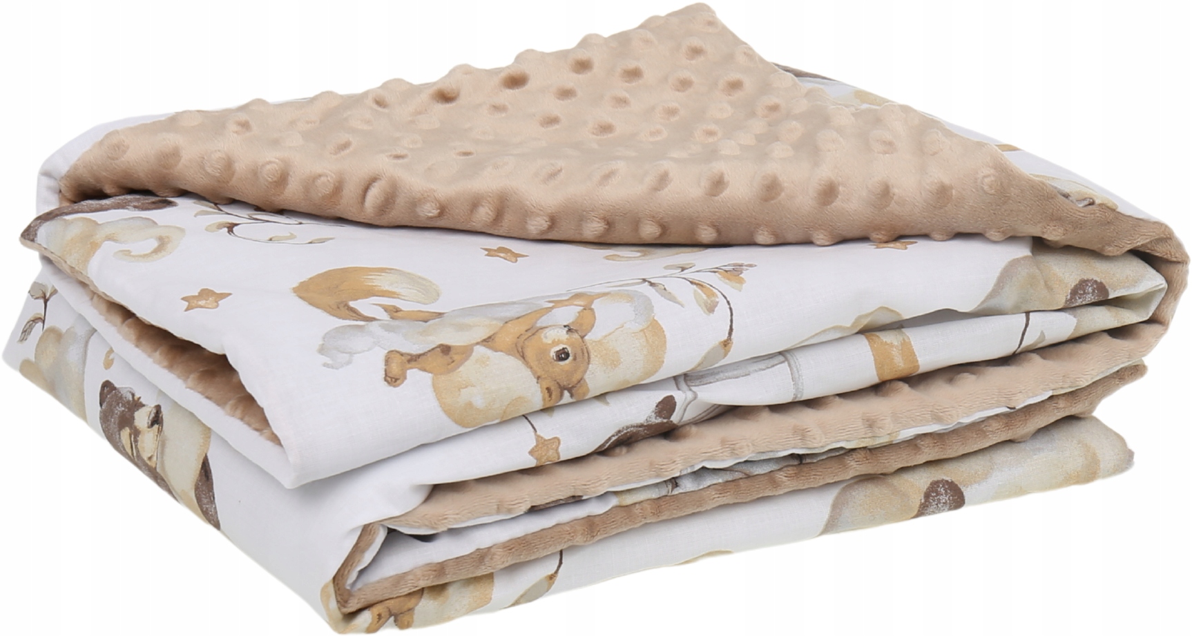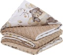 Kocyk jest dwustronny z jednej strony milutki materiał minky, z drugiej bawełna w różnych wzorach.