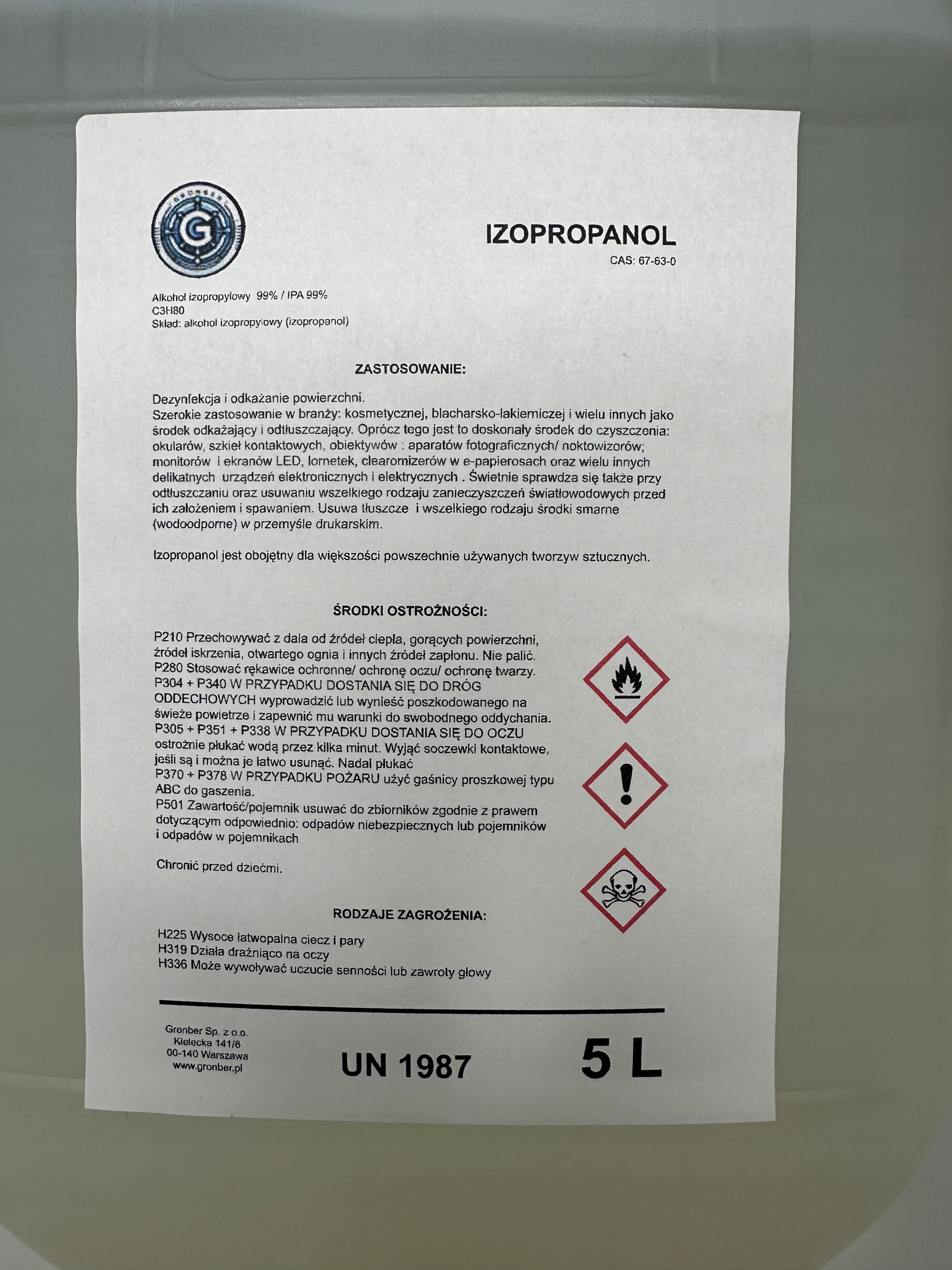 Uwagi: Izopropanol jest łatwopalny i toksyczny. Należy zachować ostrożność, unikać wdychania oparów oraz kontaktu z oczami i skórą. Stosować odpowiednie środki ochrony osobistej.