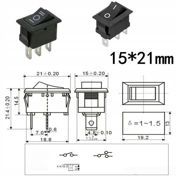 Przełącznik kołyskowy klawiszowy KCD1, ON/OFF/ON. Posiada standardowe wyprowadzenia 3PIN do zalutowania przewodów bądź nasunięcia konektora elektrycznego 4.8mm.
