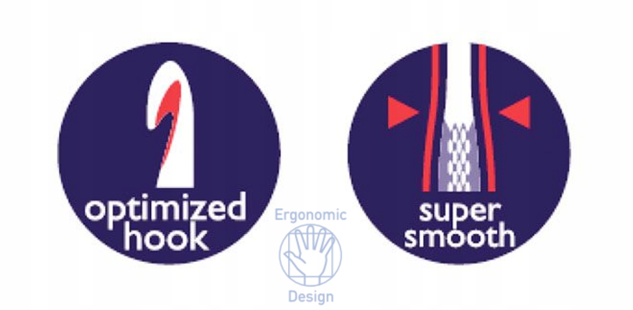 Polerowany trzonek o wysokim połysku pozwala na łatwe przesuwanie ściegów, a ergonomiczny kształt antypoślizgowego plastikowego uchwytu zapewnia przyjemne i niemęczące szydełkowanie.