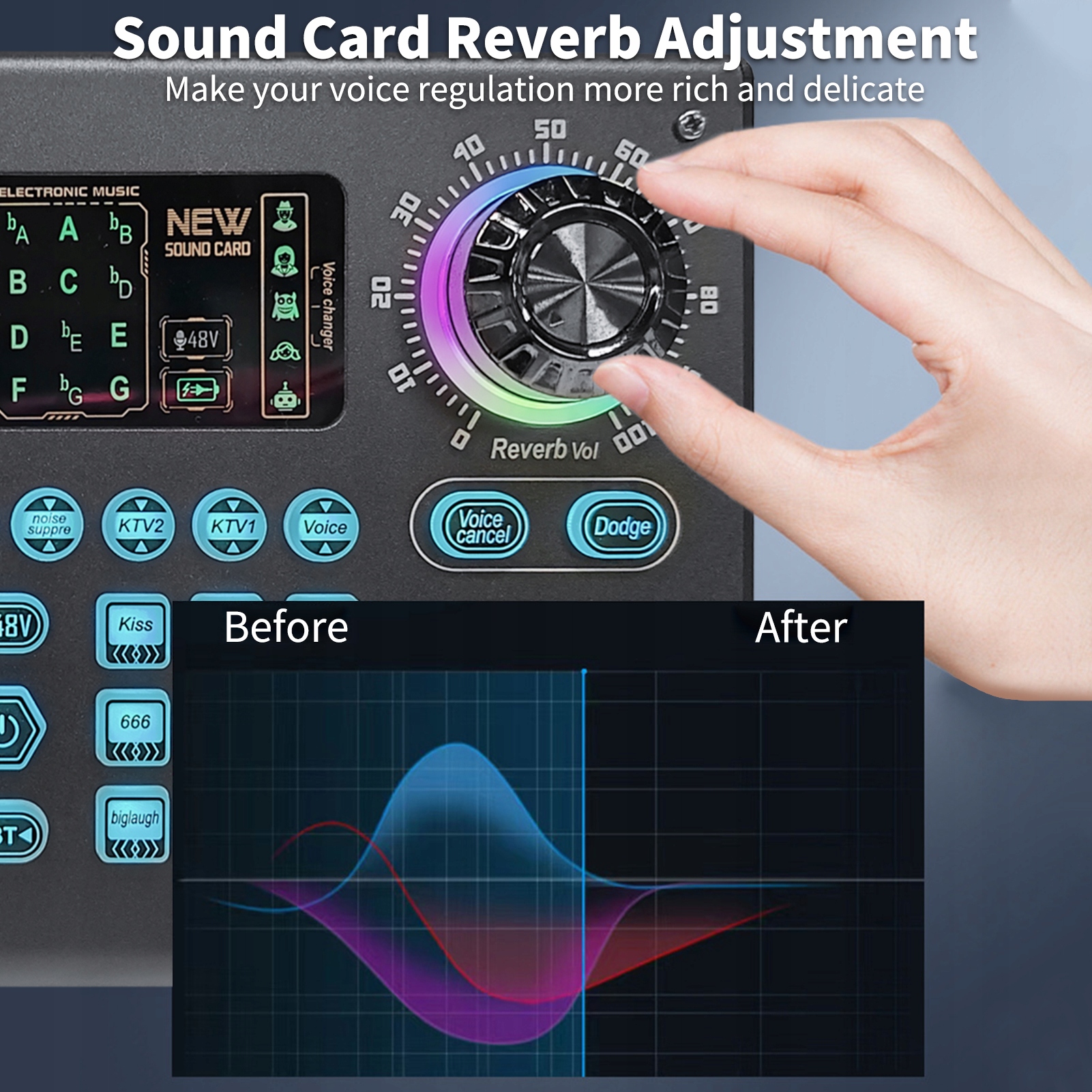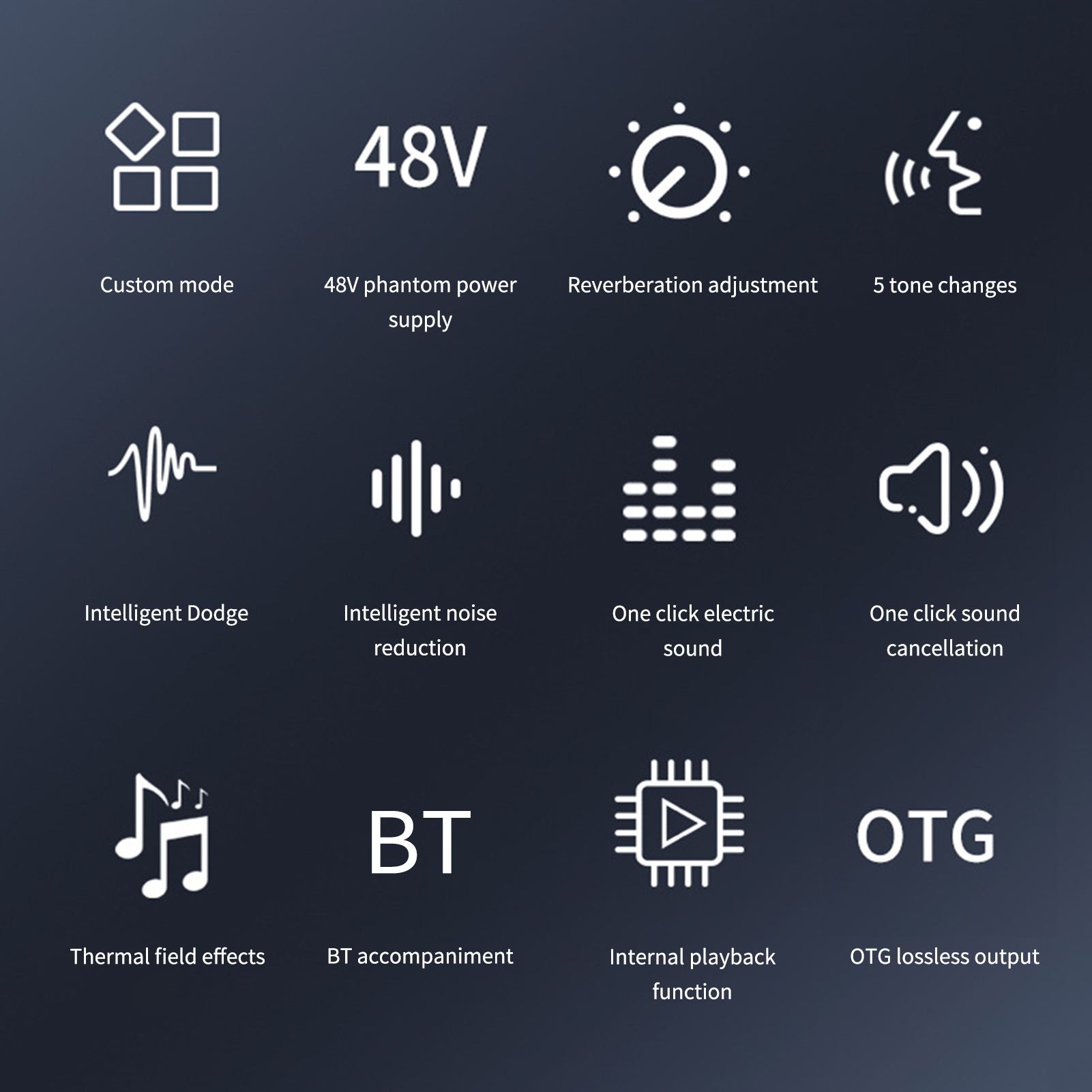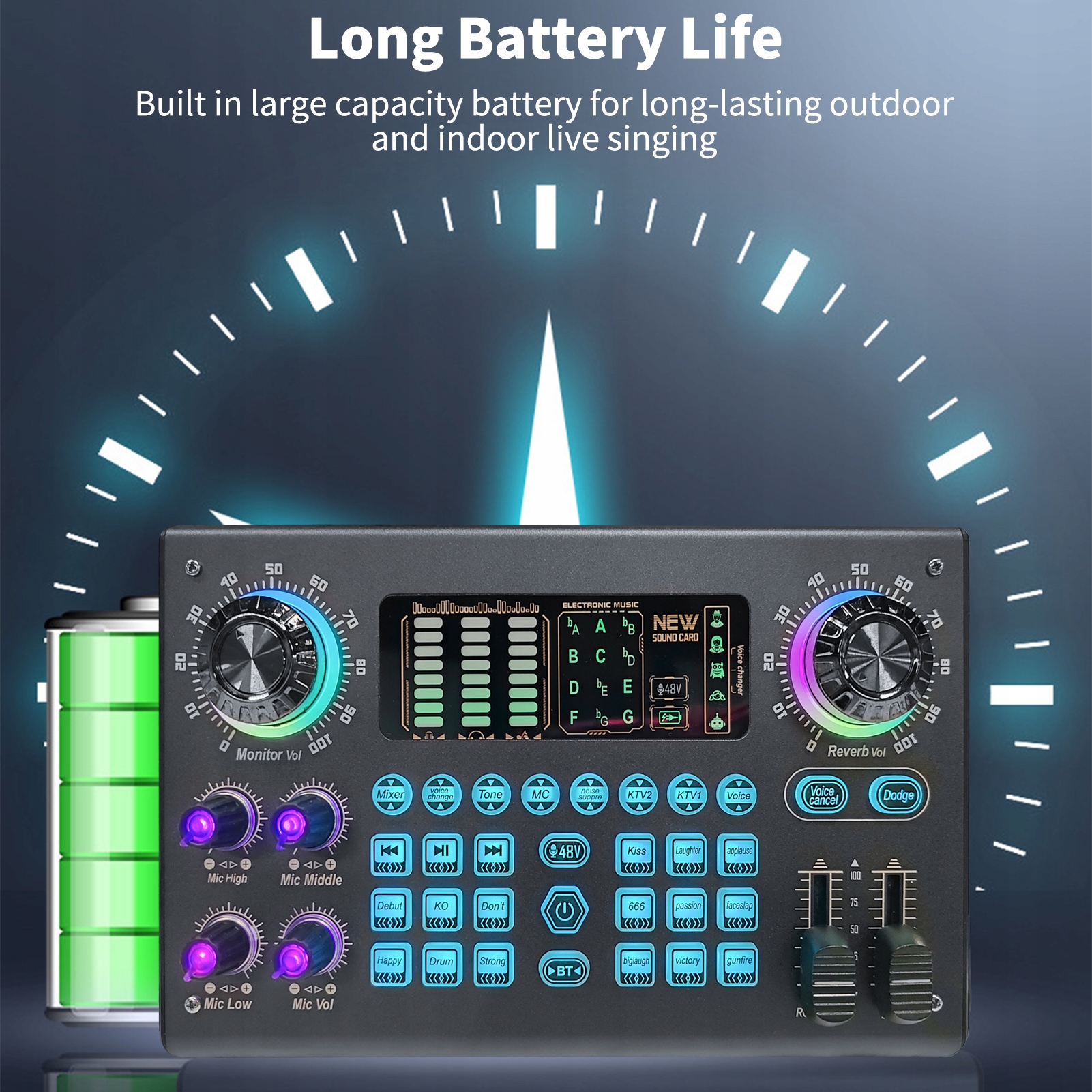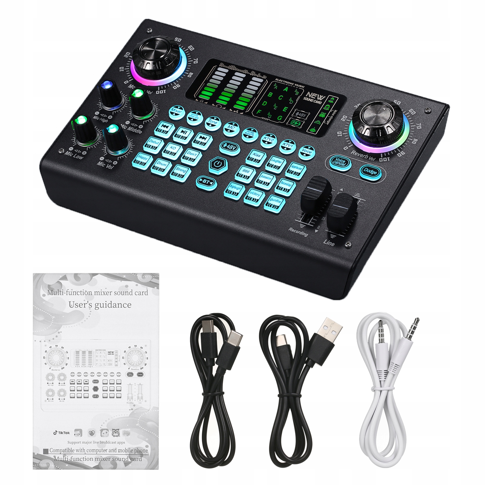 Profesjonalny sprzęt do nagrywania na żywo, który jest obecnie bardzo popularny w przypadku transmisji na żywo w Internecie, mobilnej piosenki K i innych platform. Produkt z wbudowanym dwurdzeniowym układem cyfrowym DSP może dowolnie przełączać wiele trybów scen i obsługuje dwa mikrofony, podwójne transmisje na żywo, podwójne słuchawki. Posiada również regulację tonów wysokich i niskich, unikanie jednego klawisza, eliminację oryginalnego dźwięku jednym klawiszem, redukcję szumów jednym klawiszem, wiele grup dostrajania zmiany dźwięku i inne funkcje. Obsługuje większość programów do transmisji na żywo, takich jak TikTok, Zynn, Singba, Wesing, Love Sing, Yingke, Huajiao, Nonolive i inne platformy na żywo.