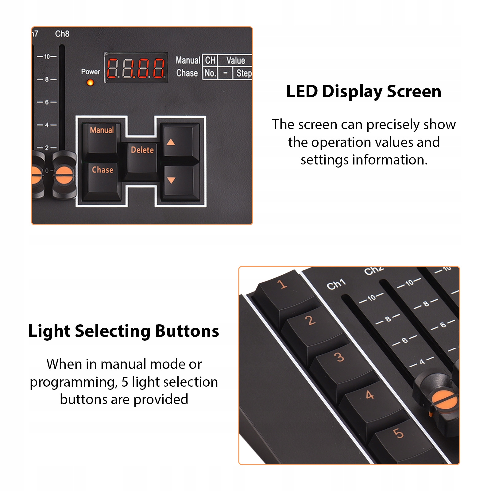 【Wszechstronna funkcjonalność】: Nasz kontroler obsługuje 5 różnych efektów CHASE, przy czym każdy efekt może mieć do 50 indywidualnych kroków. Zapewnia to nieograniczone możliwości tworzenia dynamicznych sekwencji świetlnych i dodawania emocji Twoim przyjęciom lub występom scenicznym.