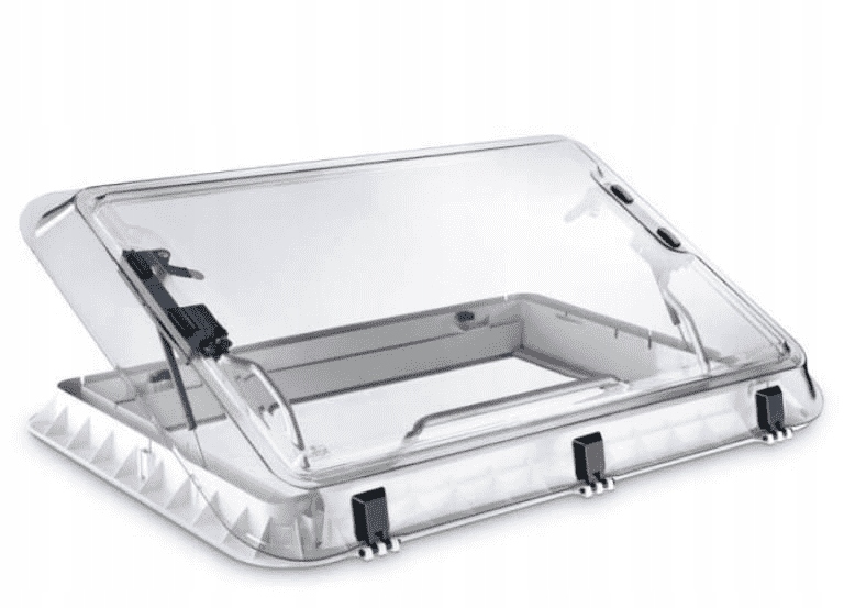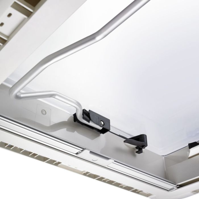 Okno dachowe Dometic Heki 2 jest idealne do przyczepy kempingowej i wpuszcza do środka lekkie i świeże powietrze, Rolowana moskitiera i roleta zaciemniająca, które można przesuwać osobno lub razem, są przymocowane do wewnętrznej ramy, Panel okna można łatwo otworzyć za pomocą metalowego pręta, a sprężyny pneumatyczne utrzymują go na miejscu, Specjalna pozycja na niepogodę zapobiega wpadaniu deszczu do pojazdu i podnoszeniu panelu przez wiatr,