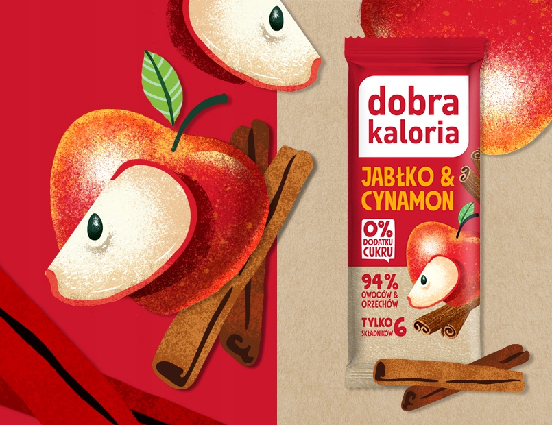 Daktyle suszone (62 %), jabłka suszone (14 %) (zawierają siarczyny), orzechy nerkowca (11 %), rodzynki, chrupki zbożowe (mąka kukurydziana, mąka ryżowa), cynamon (0,8 %). Może zawierać inne orzechy, orzeszki ziemne, nasiona sezamu, zboża zawierające gluten oraz pestki owoców lub ich fragmenty. Bez dodatku cukrów. Zawiera naturalnie występujące cukry.