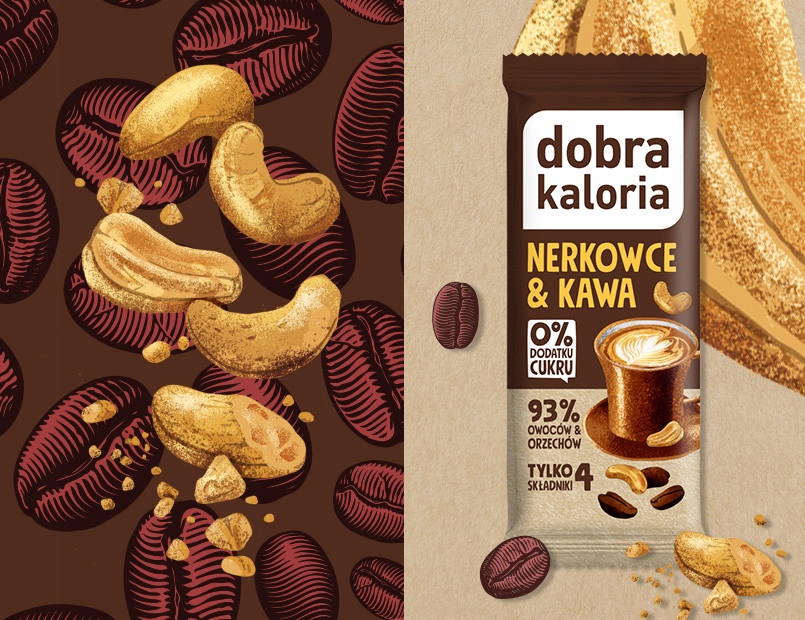 Daktyle, orzechy nerkowca (12%), kawa mielona (4%), chrupki zbożowe (mąka kukurydziana, mąka ryżowa). Produkt naturalny: pomimo naszych starań może zawierać pestki owoców lub ich fragmenty. Bez dodatku cukrów. Zawiera naturalnie występujące cukry.