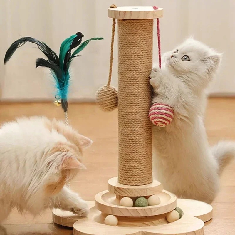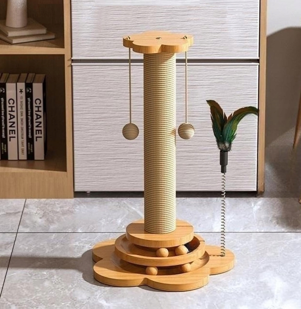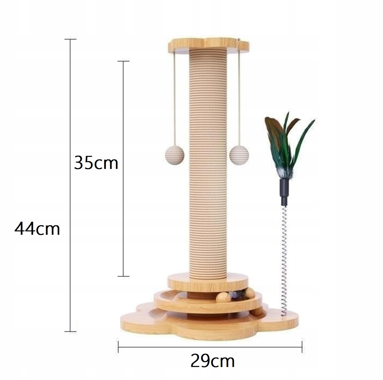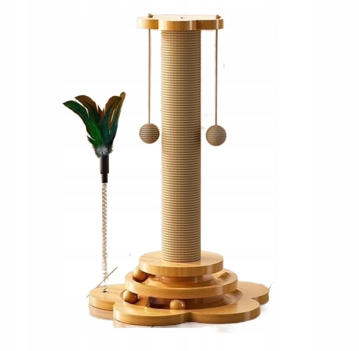 Drapak i miejsce do zabawy w jednym. Oprócz podstawowej funkcji, jaką jest słupek do drapania, posiada również zabawki w formie piłeczek (w tym dwie wypełnione kocimiętką), jak również piórka na sprężynce. Stabilna, drewniana podstawa zapobiega przewróceniu się zabawki. Zapewni Waszym kocim przyjaciołom wiele radości, oraz ogrom świetnej zabawy.