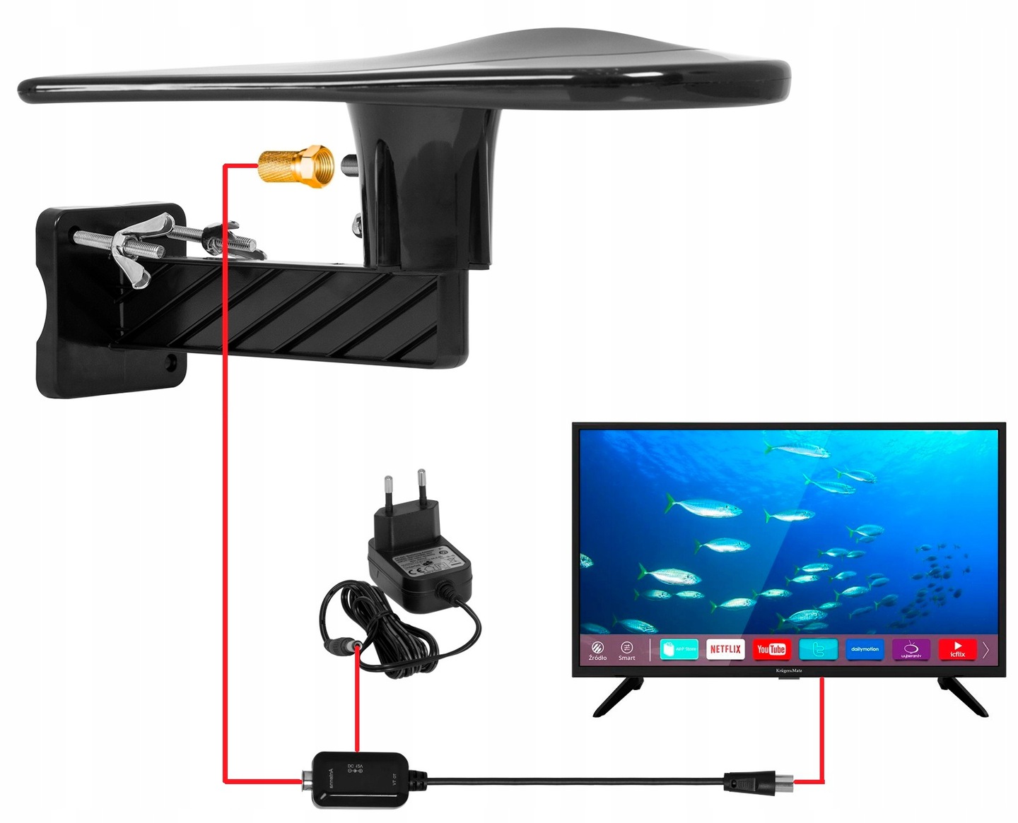 ZESTAW ZAWIERA: Antena DigiActiv, Zasilacz antenowy 12V, Adapter zasilacza, Przewód antenowy (wtyk f - wtyk antenowy) 8m, Wzmacniacz (wbudowany w antenę), Cybant montażowy, Uchwyt ścienny, Instrukcje montażu anteny