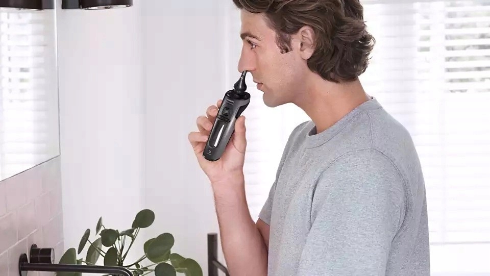 Trymer usuwa zbędne owłosienie z nosa i uszu. Technologia ProtecTrim i specjalnie zaprojektowany kąt nachylenia trymera umożliwiają łatwe i wygodne przycinanie włosów.