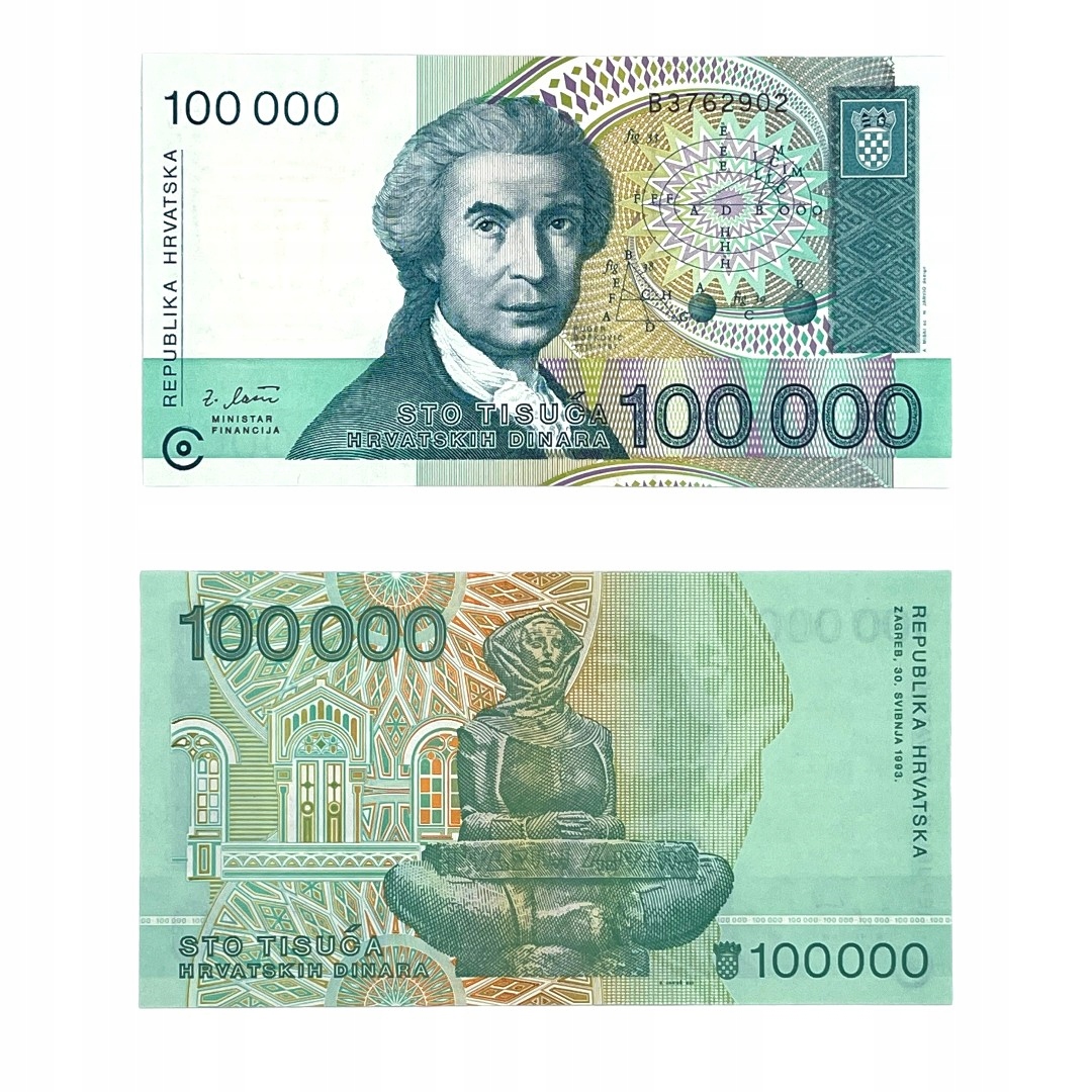 Banknot zagraniczny z kraju Chorwacja o nominale 100000 Dinarów.