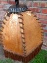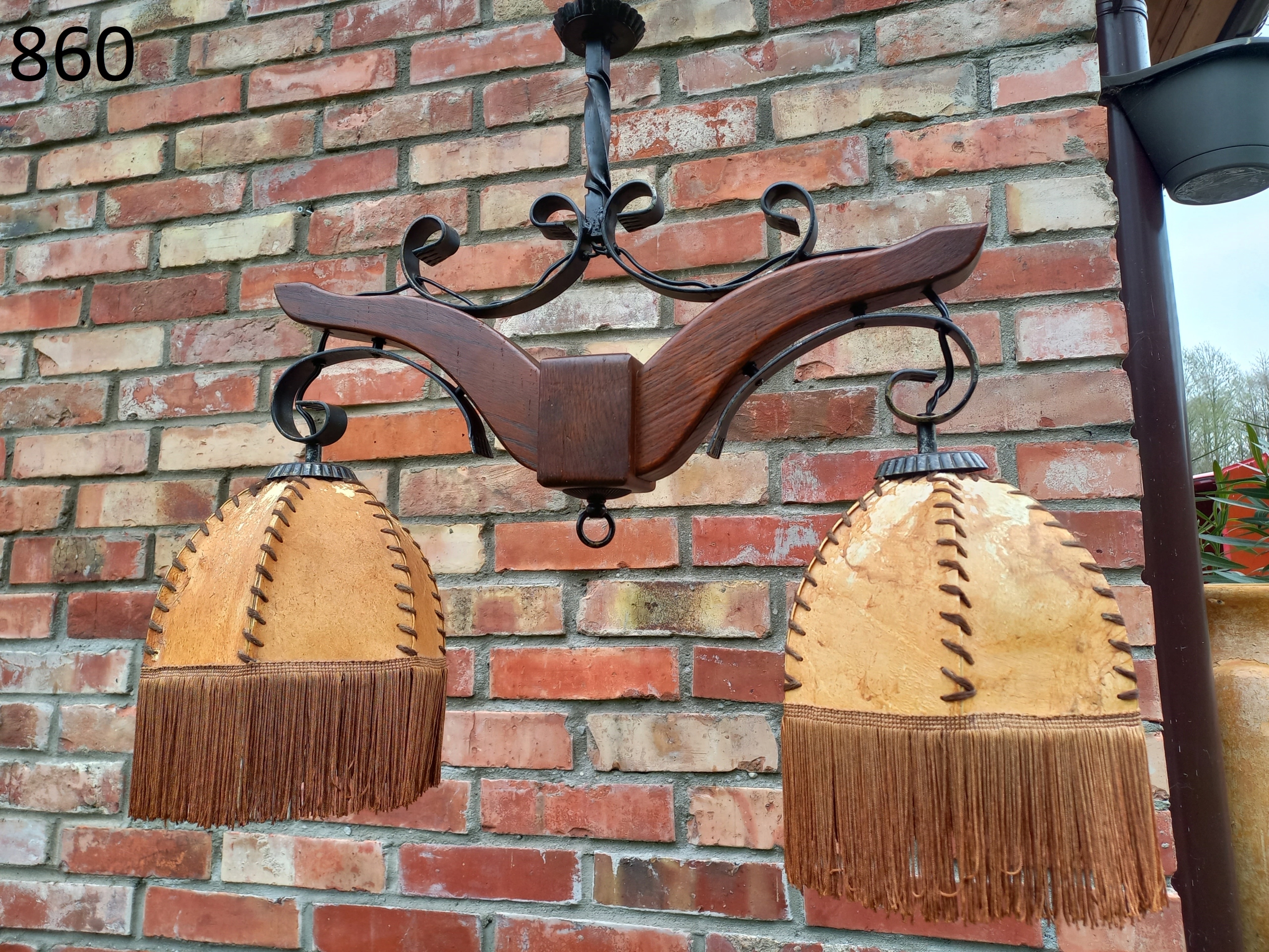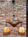 Przedmiotem mojej oferty jest żyrandol dwuramienny ze skórzanymi kloszami. Instalacja elektryczna jest sprawna. Klosze są całe.