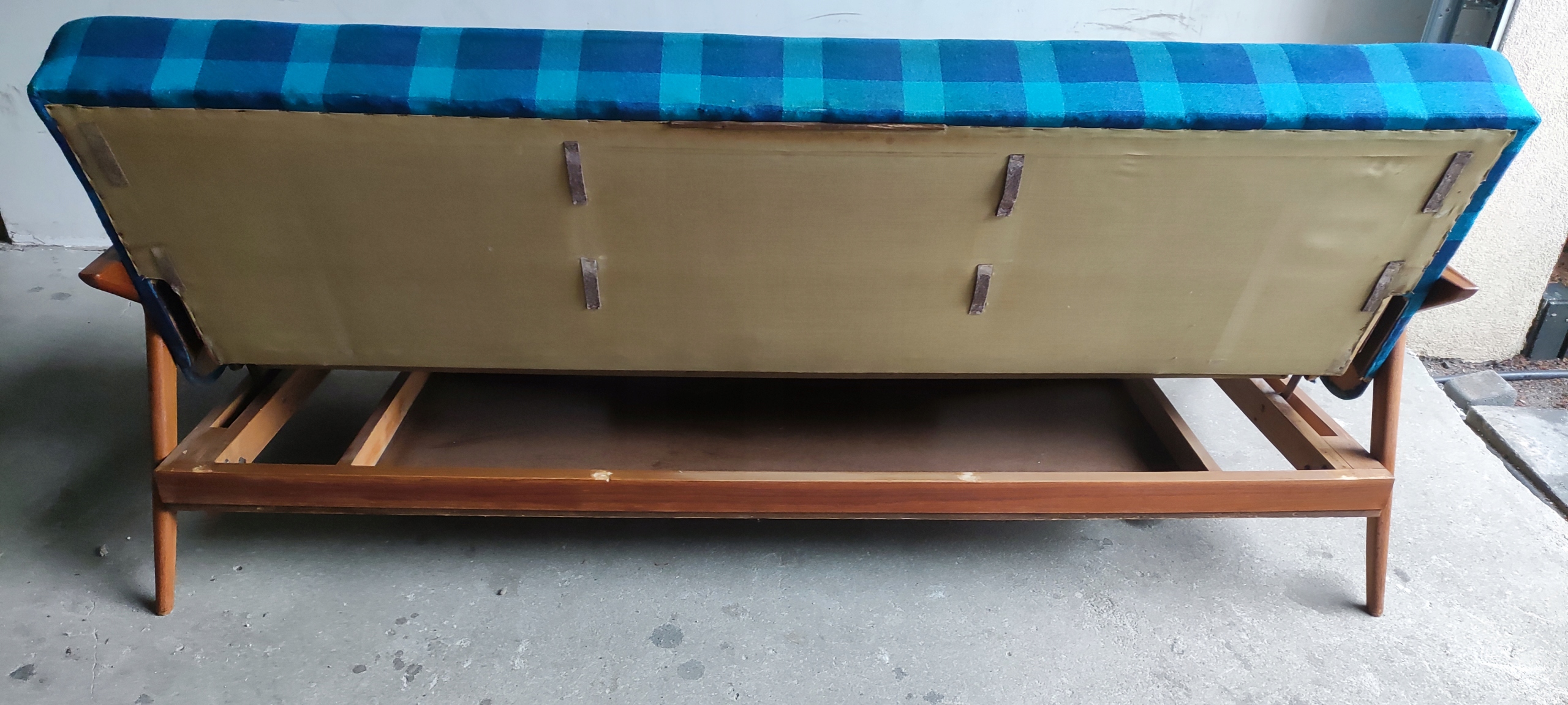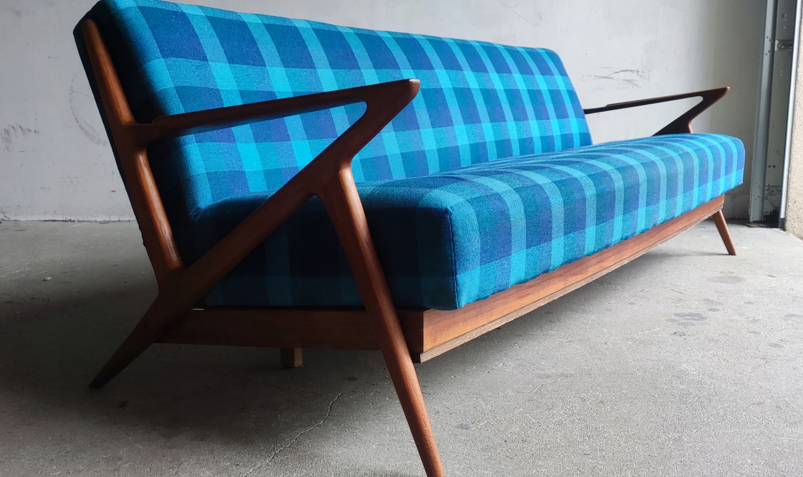 Leżanka wykonana z drewna tekowego z podłokietnikami w kształcie litery Z ,pokryta turkusową kraciastą tkaniną.