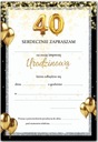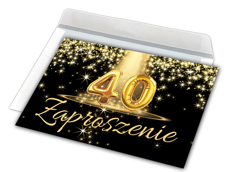 Na przedniej stronie na środku liczba 40 utworzona z balonów, od góry opadające gwiazdki, na dole napis "Zaproszenie".