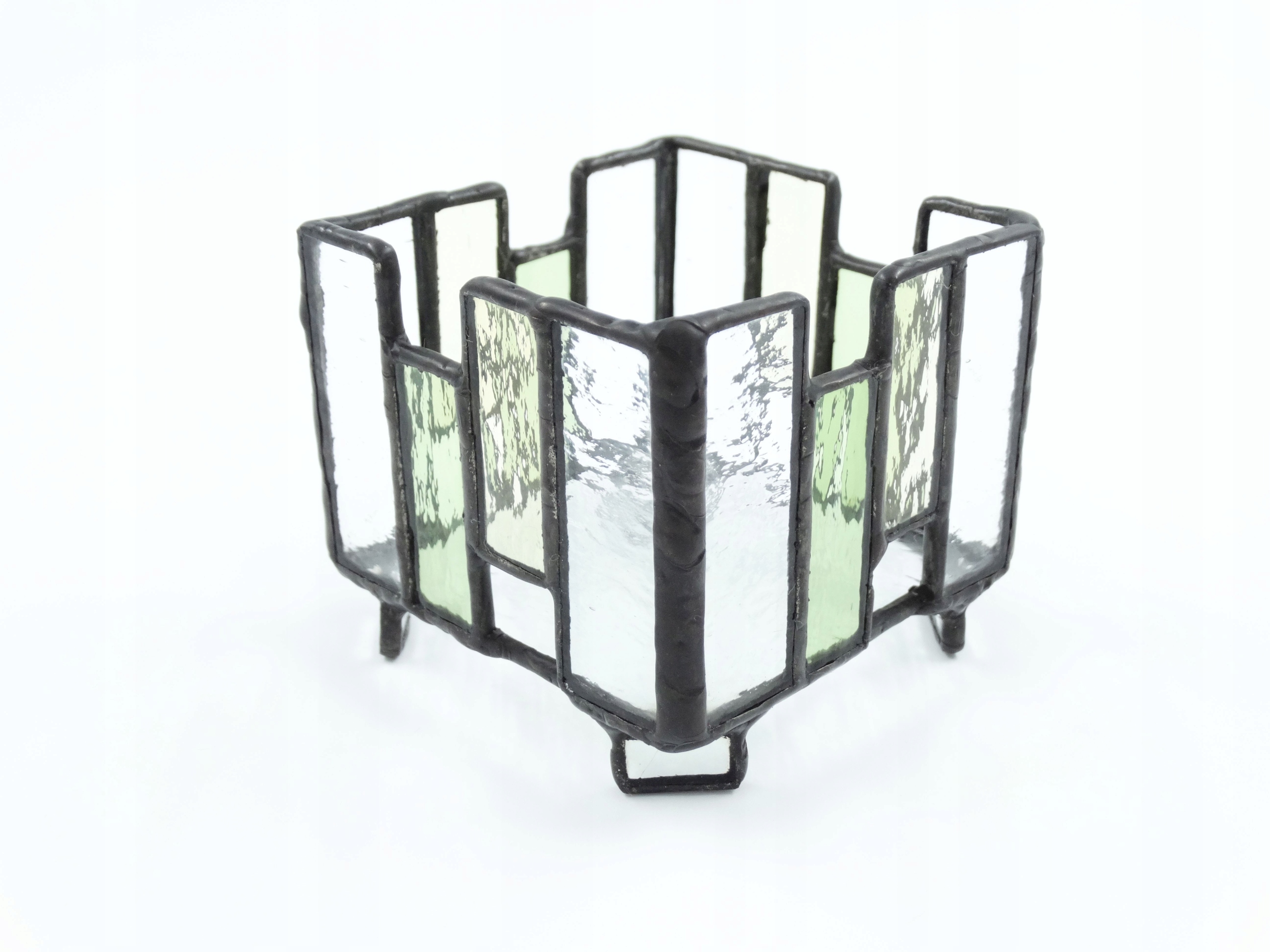Świecznik wykonany techniką Tiffany'ego z wysokiej jakości szkła witrażowego, patynowany na czarno. Idealny pod tealight'y. Szkło przezierne ze strukturą w kolorze białym, zielonym i słomkowym.