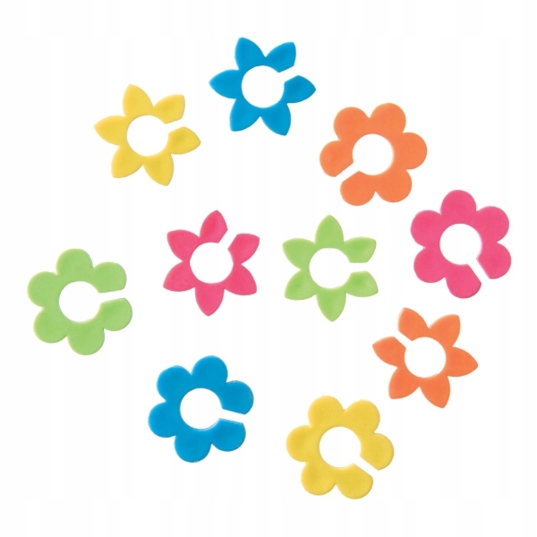 ✔️ PRZYDATNE - Zestaw 10 sztuk kolorowych znaczników na szklanki. Znaczniki są w kształcie kwiatków są dostępne w dwóch rozmiarach o średnicy 2,5 cm i 2 cm. Świetny sposób na oznaczenie szklanek i kieliszków.