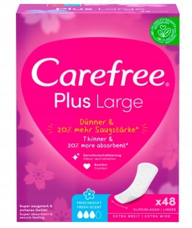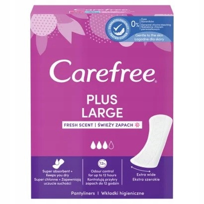 Wkładki higieniczne, szersze i dłuższe niż zwykłe wkładki. Łagodne dla skóry o świeżym zapachu - Carefree Plus Large Fresh Scent.Carefree Plus Large Wkładki higieniczne o świeżym zapachu.
