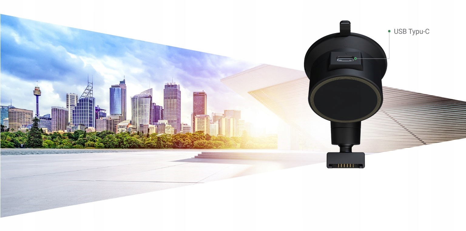 Uchwyt na przyssawkę z obrotowym mechanizmem blokującym zapewnia bezpieczny montaż rejestratora na szybie samochodu. Ponadto, dla ułatwienia montażu i podłączenia do zasilania, urządzenie posiada przelotowe zasilanie poprzez złącze USB typu C umieszczone na uchwycie. Drugie złącze USB typu C znajduje się na korpusie urządzenia i przeznaczone jest do podłączenia rejestratora do komputera.