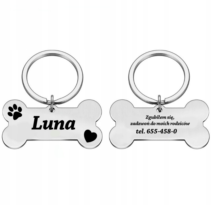 Na przedniej stronie zawieszki zawsze znajduje się łapka oraz serduszko + imię pupila.