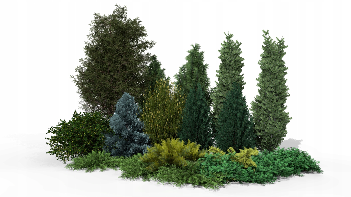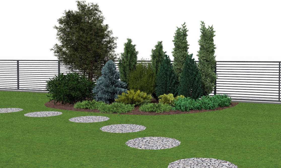 Zaczynając od płożących cisów i jałowców, poprzez niewysokie berberysy i jodłę kalifornijską, aż po najwyższe jałowce kolumnowe, cyprysik Lawsona oraz cis pospolity - ułożenie roślin tworzy piękne kurtyny.
