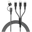 Mocny, pleciony, nylonowy kabel USB z trzema różnymi rodzajami końcówek.