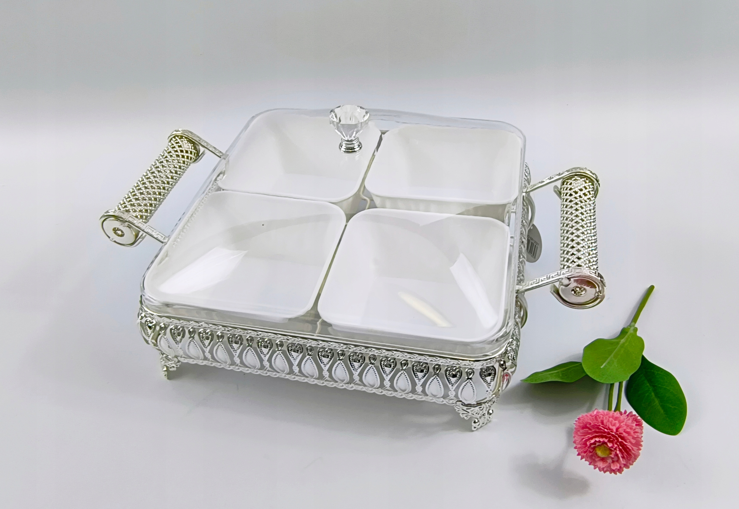 W skład zestawu wchodzi : Serwis do przystawek, który składa się z 4 pojemniczków przedzielonych na 4 części umieszczonych na podstawie wykonanej z dekoracyjnego metalu w kolorze złotym . Dodatkowo posiada pokrywę z gustownym uchwytem.