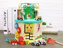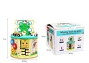 Dzieci z każdej strony skrzynki będą mogły odkrywać niespodzianki takie jak: ruchome obrotowe elementy (zębatki), ruchome obrotowe elementy z rysunkami, przesuwanie elementów, kolorowe liczydło, zegar.