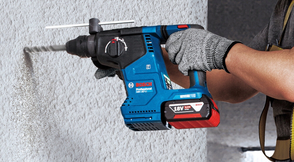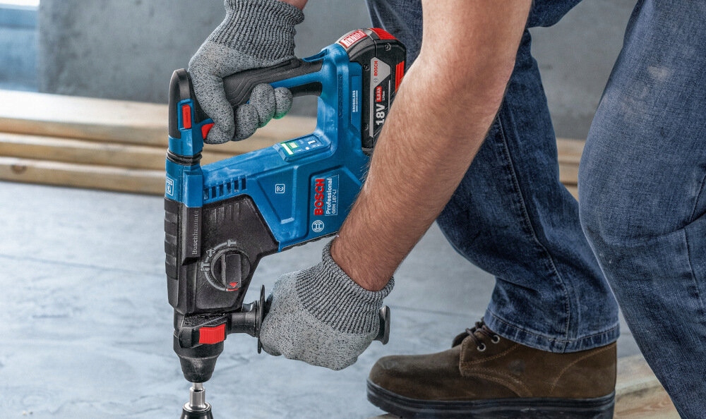 Pełną kontrolę nad młotem BOSCH Professional GBH 187-LI użytkownik zachowuje dzięki wygodnym rękojeścią – główną oraz dodatkową. Uchwyty zostały pokryte antypoślizgową powłoką, która jest gwarancją pewnego chwytu podczas pracy. Wpływa to na jakość i bezpieczeństwo pracy, a doskonałe wyważenie sprzętu sprawia, że praca stanie się mniej męcząca, nawet przez długi okres pracy.