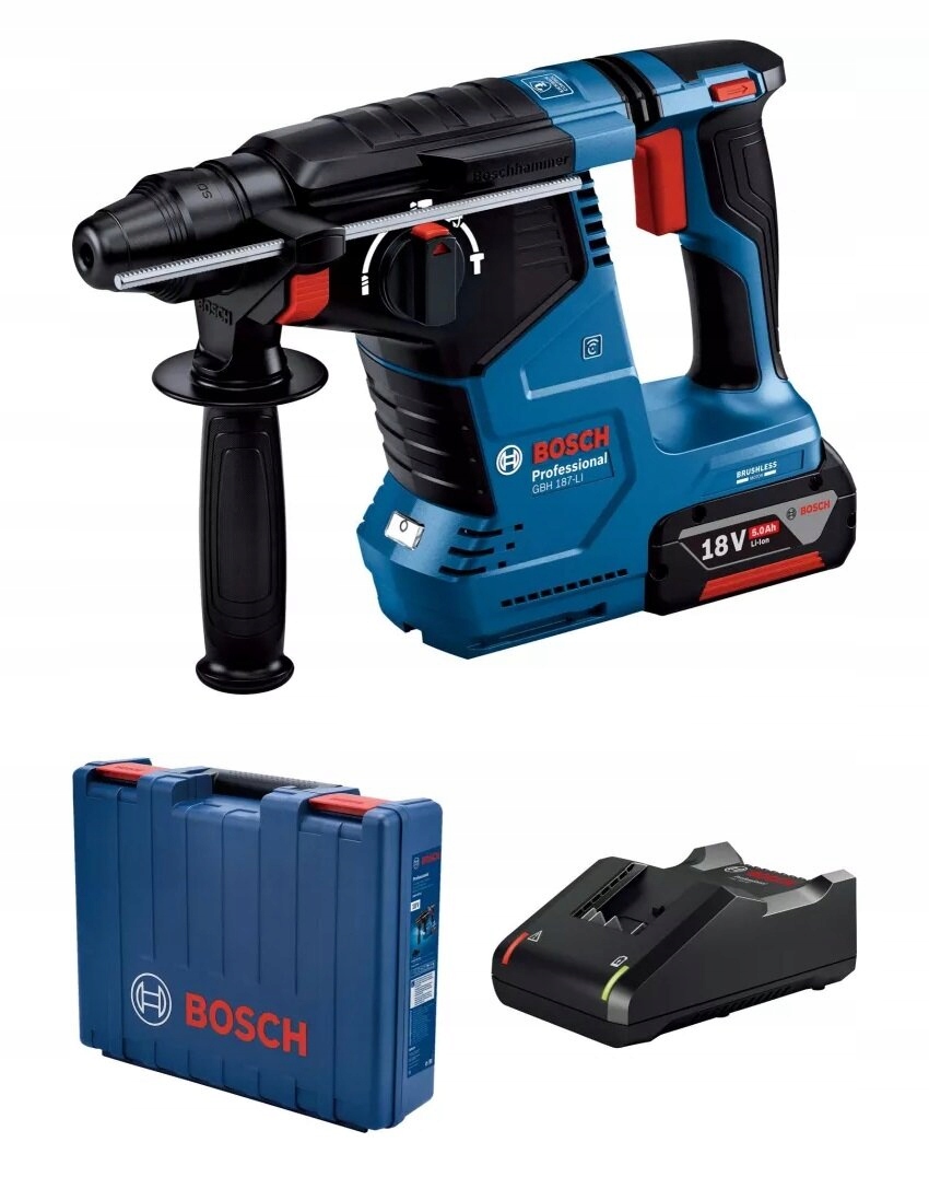 W zestawie wraz z młotem udarowo-obrotowym BOSCH Professional GBH 187-LI znajduje się akumulator wraz z ładowarka, a także walizka transportowa i niezbędna dokumentacja.