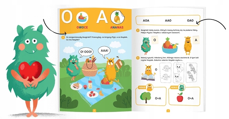 W środku znajdują się rebusy atrakcyjne ilustracje ze scenkami dialogowymi, a także urozmaicone zagadki i zadania, które angażują uwagę przedszkolaków i pozwalają czerpać radość z czytania pierwszych sylab i wyrazów.