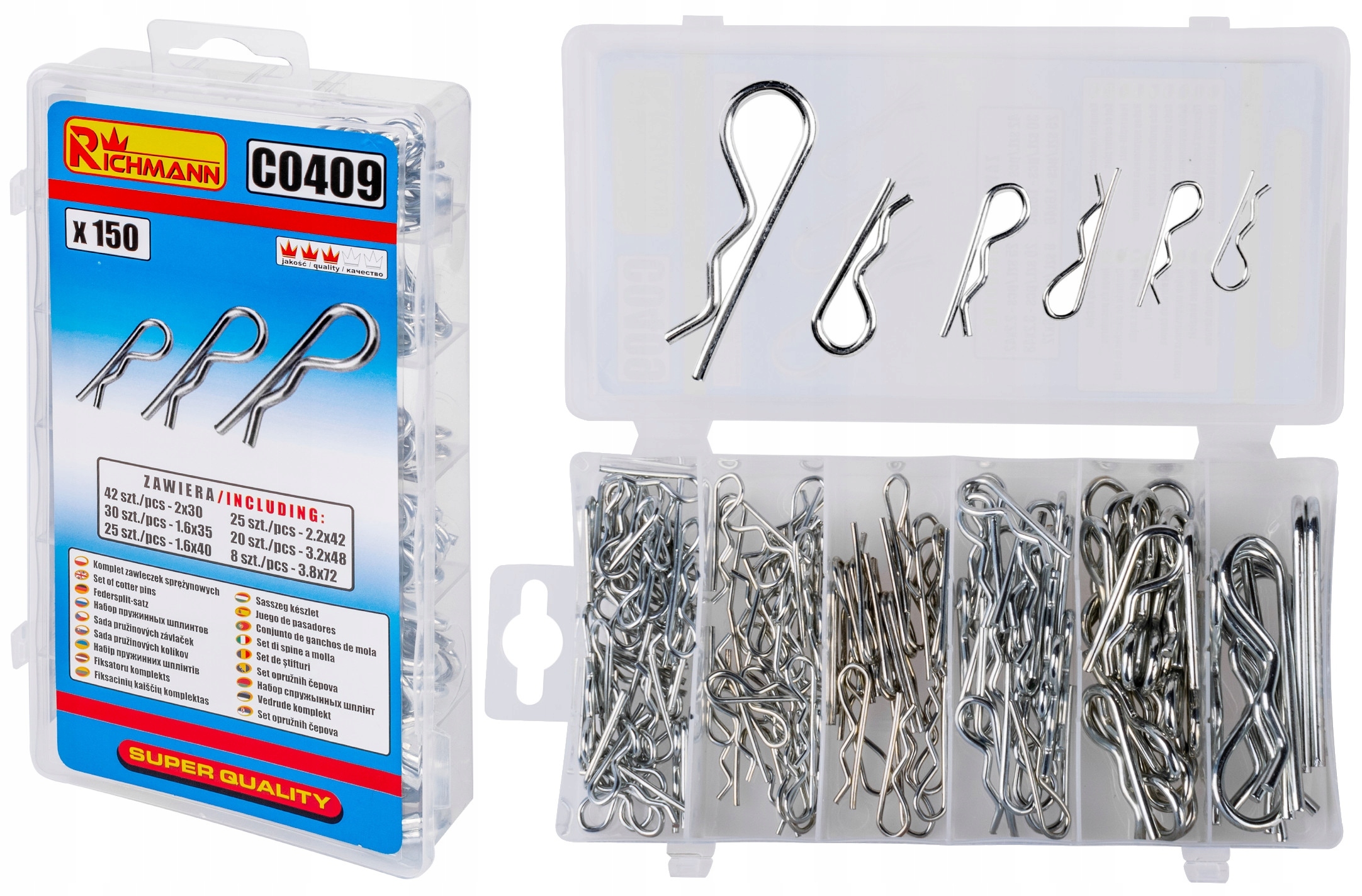 Uniwersalny zestaw zawleczek sprężynowych przydatny zarówno w profesjonalnym serwisie jak i w przydomowym garażu.