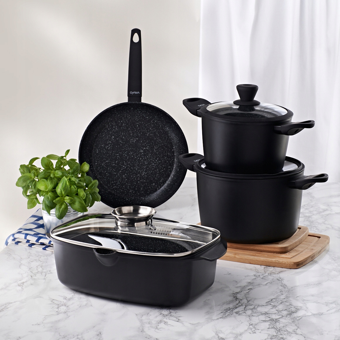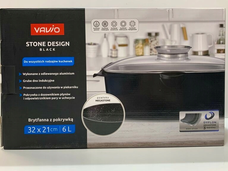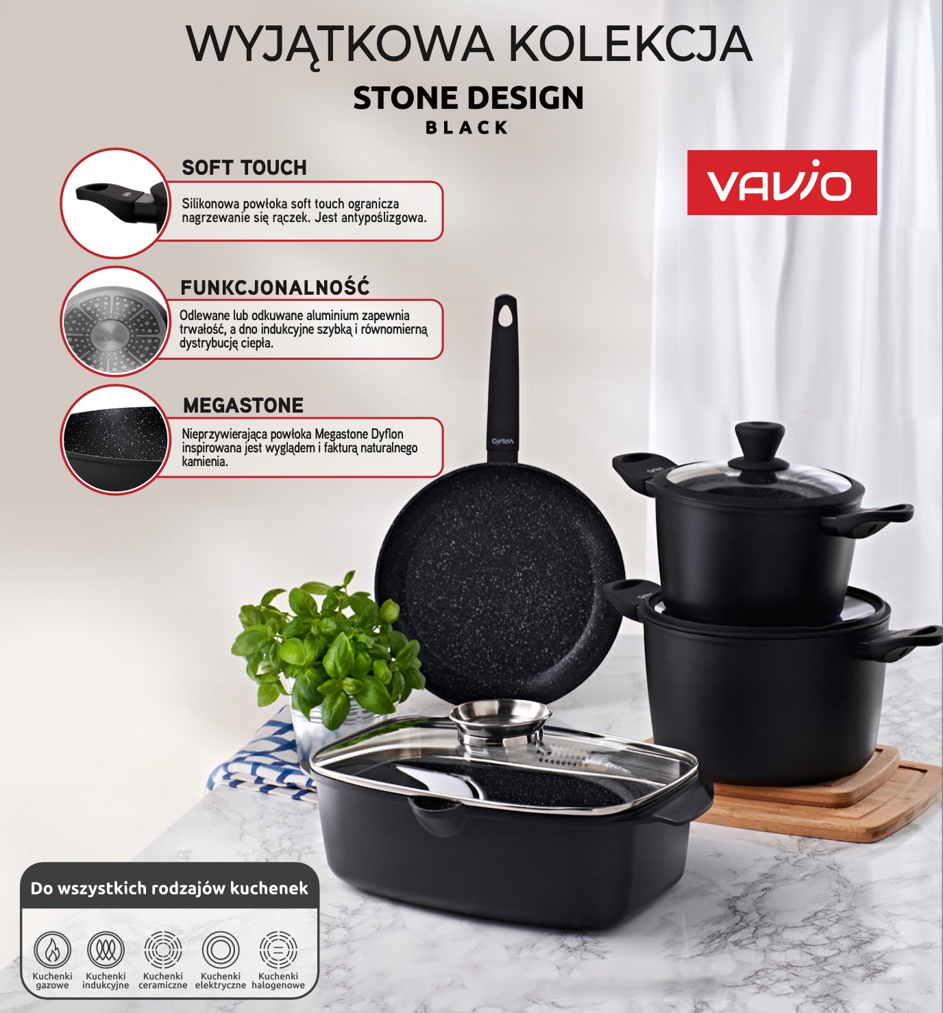 Vavio Stone Design Black to wyjątkowa kolekcja naczyń wykonanych z odlewanego lub odkuwanego aluminium, pokrytych inspirowaną wyglądem i fakturą kamienia powłoką Megastone Dyflon.