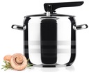 Szybkowar Allegro z zamkiem bagnetowym marki Banquet został wykonany ze stali nierdzewnej 18/0 oraz tworzywa sztucznego. Grubość ścianek naczynia to 0,6 mm, co pozwala na dłuższe utrzymywanie ciepła. Szybkowar posiada grube, wielowarstwowe dno, dzięki czemu skumulowane podczas podgrzewania ciepło równomiernie się po nim rozchodzi. Przyśpiesza to gotowanie, pozwalając zaoszczędzić czas, a tym samym zużycie gazu czy energii elektrycznej. Takie dno pozwala także dłużej utrzymać temperaturę po zakończeniu gotowania. Pokrywa zawiera dwa zawory, główny zawór roboczy i pomocniczy (zawór bezpieczeństwa) na wypadek zapchania się zaworu roboczego, co powoduje, że szybkowar jest maksymalnie bezpieczny. Podczas gotowania możemy regulować ciśnienie wewnątrz naczynia, dzięki czemu łatwo i wygodnie możesz optymalizować tempo gotowania, dostosowując ciśnienie do wariantu przygotowywanej potrawy.