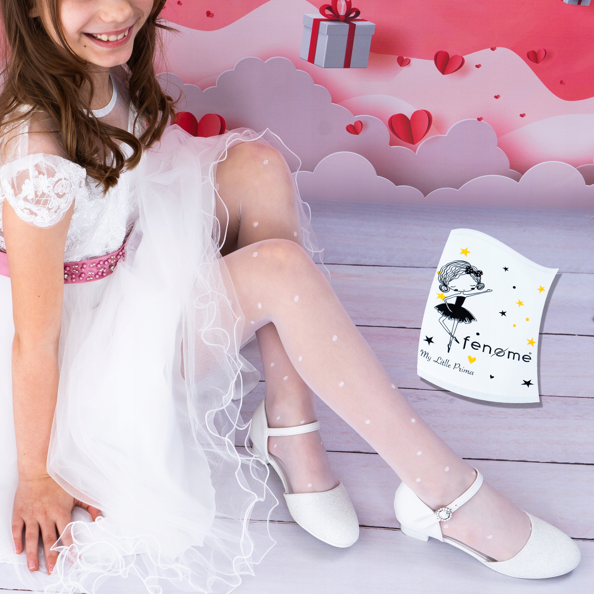 Предметом аукциона являются уникальные белые колготки для причастия для девочки, украшенные нежным мотивом точек, которые добавят очарования любому причастию стилизация.