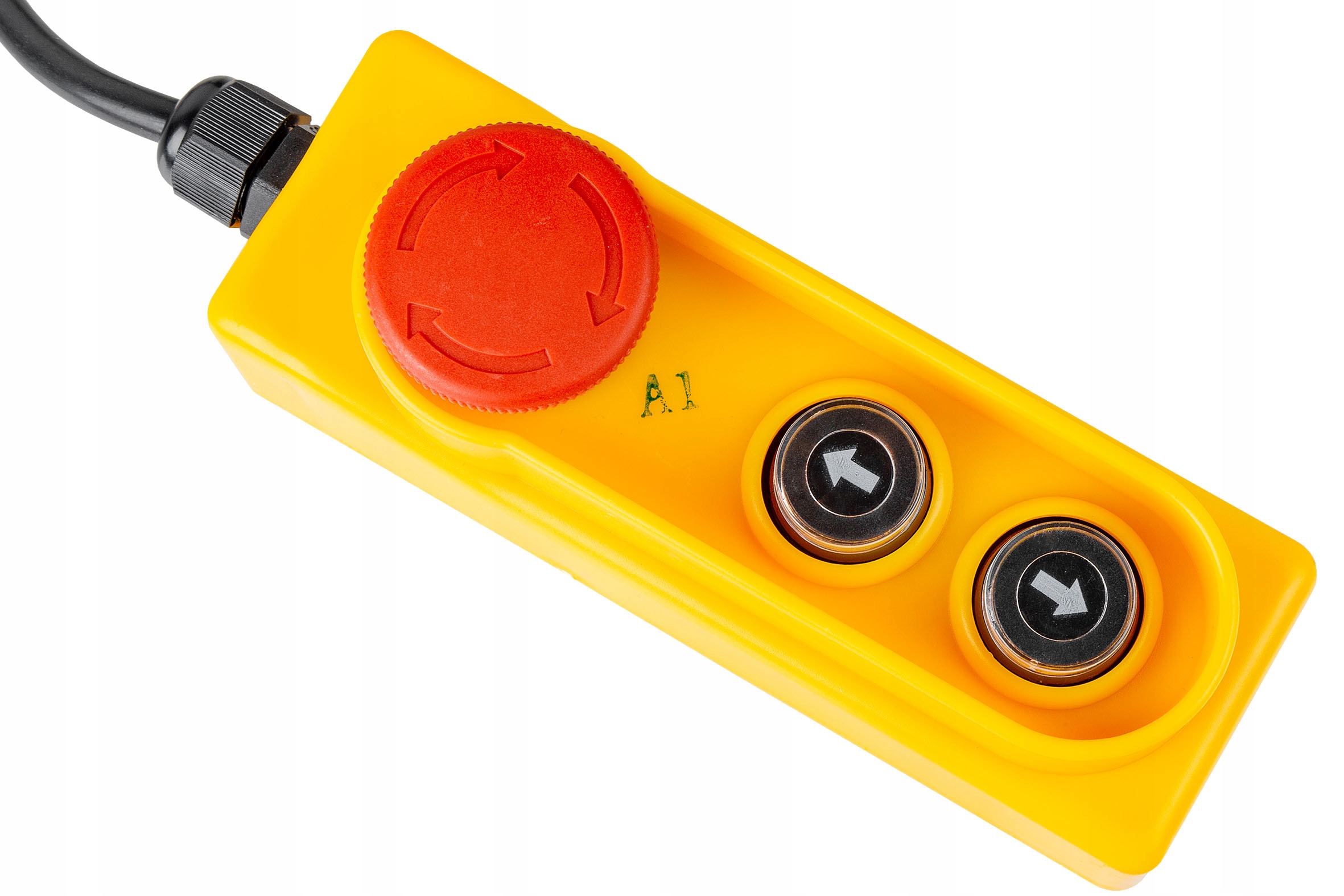 Pilot umożliwia precyzyjne sterowanie zwijaniem i rozwijaniem liny oraz posiada zabezpieczenie przed przypadkowym użyciem. Przycisk nie blokuje się w pozycji włączonej, co poprawia bezpieczeństwo i kontrolę nad urządzeniem.