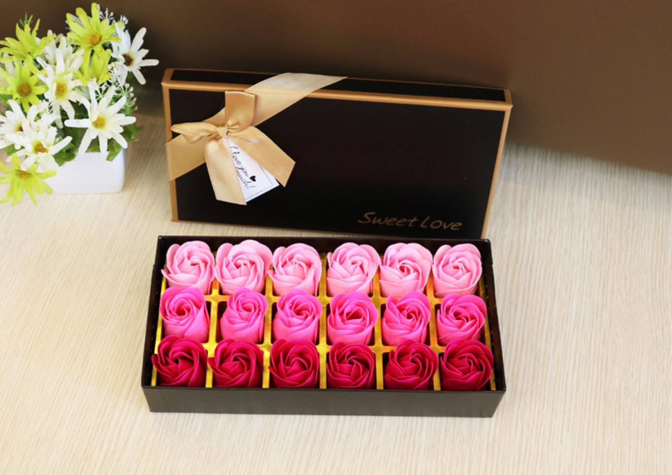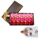 To ozdobne pudełko zawiera pięknie wykonane kwiaty z mydła, które wyglądają jak prawdziwe, ale można je używać do kąpieli lub dekoracji.