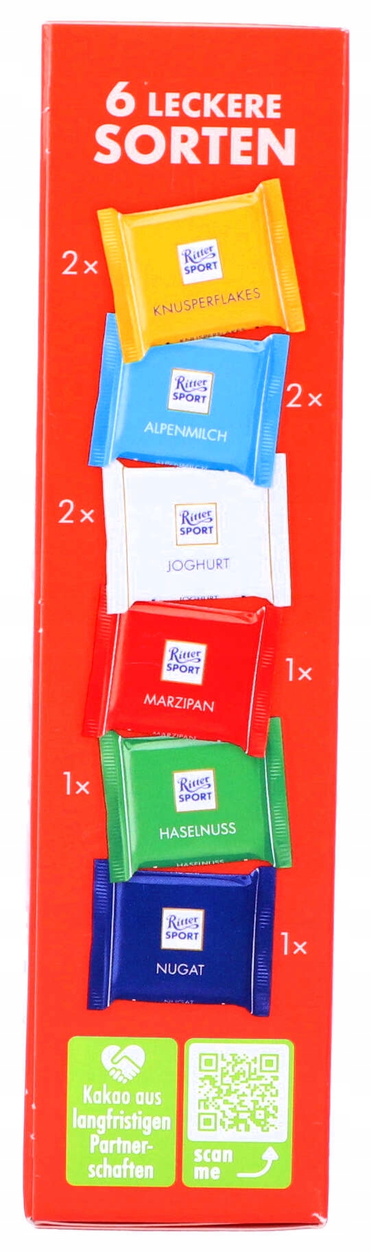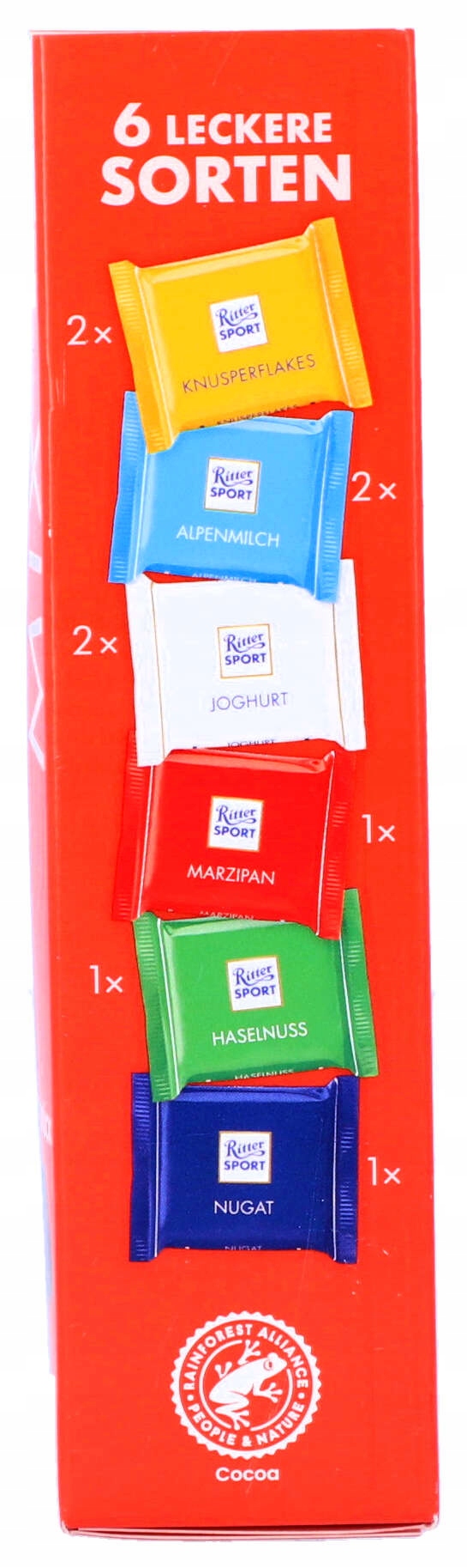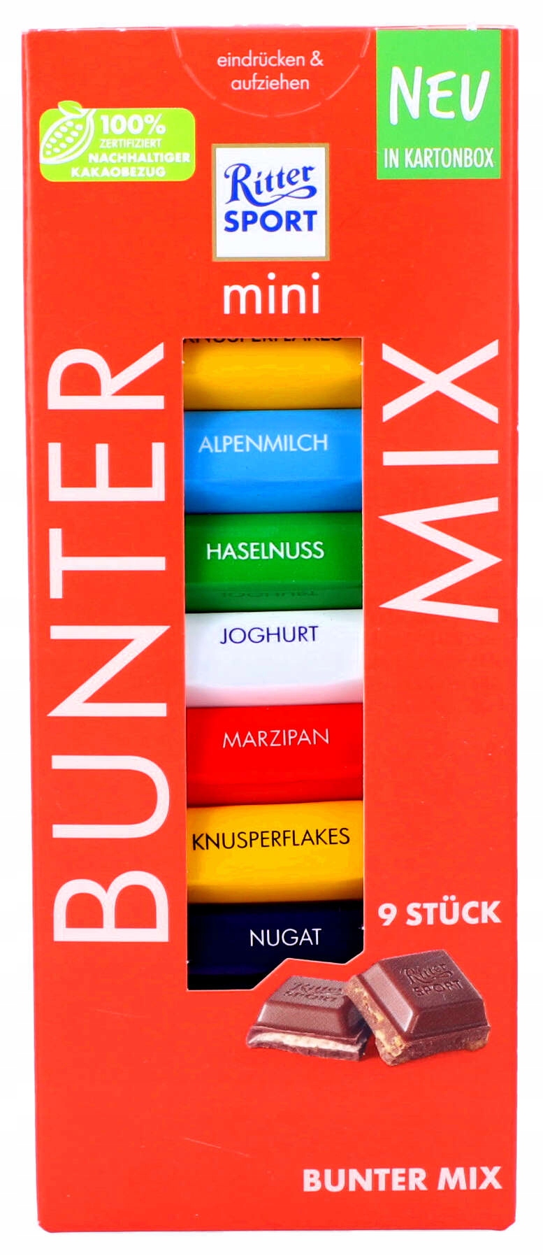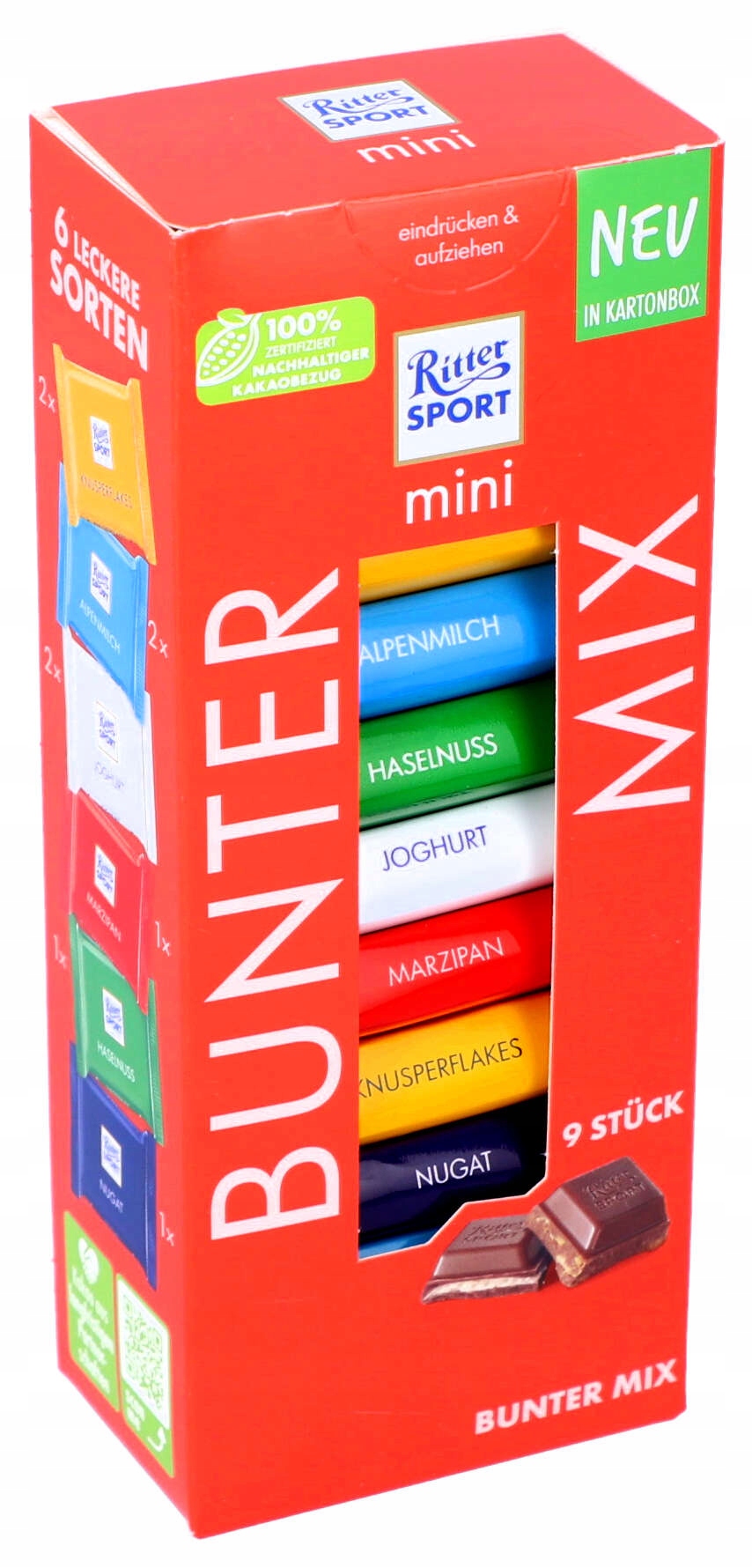 Czekoladki Ritter Sport Bunter Mix to zestaw wyjątkowych, kolorowych czekoladek o różnorodnych smakach. W opakowaniu znajdziesz 6 różnych wariantów smakowych, zapewniających niezapomnianą podróż po czekoladowych doznaniach. Każda czekoladka Ritter Sport zachwyca doskonałą jakością i wyjątkowym smakiem, sprawiając, że każdy kęs to prawdziwa przyjemność dla podniebienia.