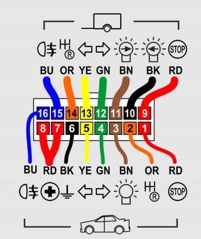Moduł WH1 jest podstawowym (i najprostszym) sterownikiem oświetlenia przyczepy, który zapewnia "powtarzanie" aktywnych świateł z tyłu samochodu na oświetleniu przyczepy. Wersja WH1R obsługuje także światło wsteczne. Wiązka WH1R-G8 posiada w komplecie gniazdo 13 PIN. Podłączenie 8 przewodów (7 podstawowych, a także jeden do światła cofania)