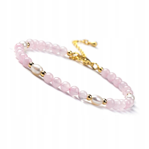 Bransoletka jest wykonana z naturalnego Kwarcu Różowego oraz Perełek. Obwód bransoletki można regulować, od 17 cm do 23cm. Kamienie jak i perełki są pochodzenia naturalnego co sprawia iż każda bransoletka jest niepowtarzalna i może nieznacznie różnić się kolorem lub odcieniem od tej przedstawionej na zdjęciu.